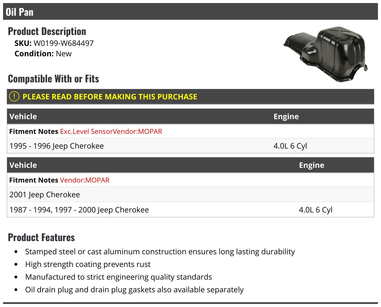 A alta resistência do revestimento aplicado ao cárter previne a corrosão, garantindo que a peça mantenha sua integridade ao longo do tempo. Fabricado sob rigorosos padrões de qualidade de engenharia, este cárter de óleo não só atende, mas supera as expectativas de desempenho e confiabilidade. Para facilitar a manutenção, o cárter também é compatível com o sensor de nível de óleo da MOPAR, assegurando que você tenha um controle preciso do nível de óleo do motor.