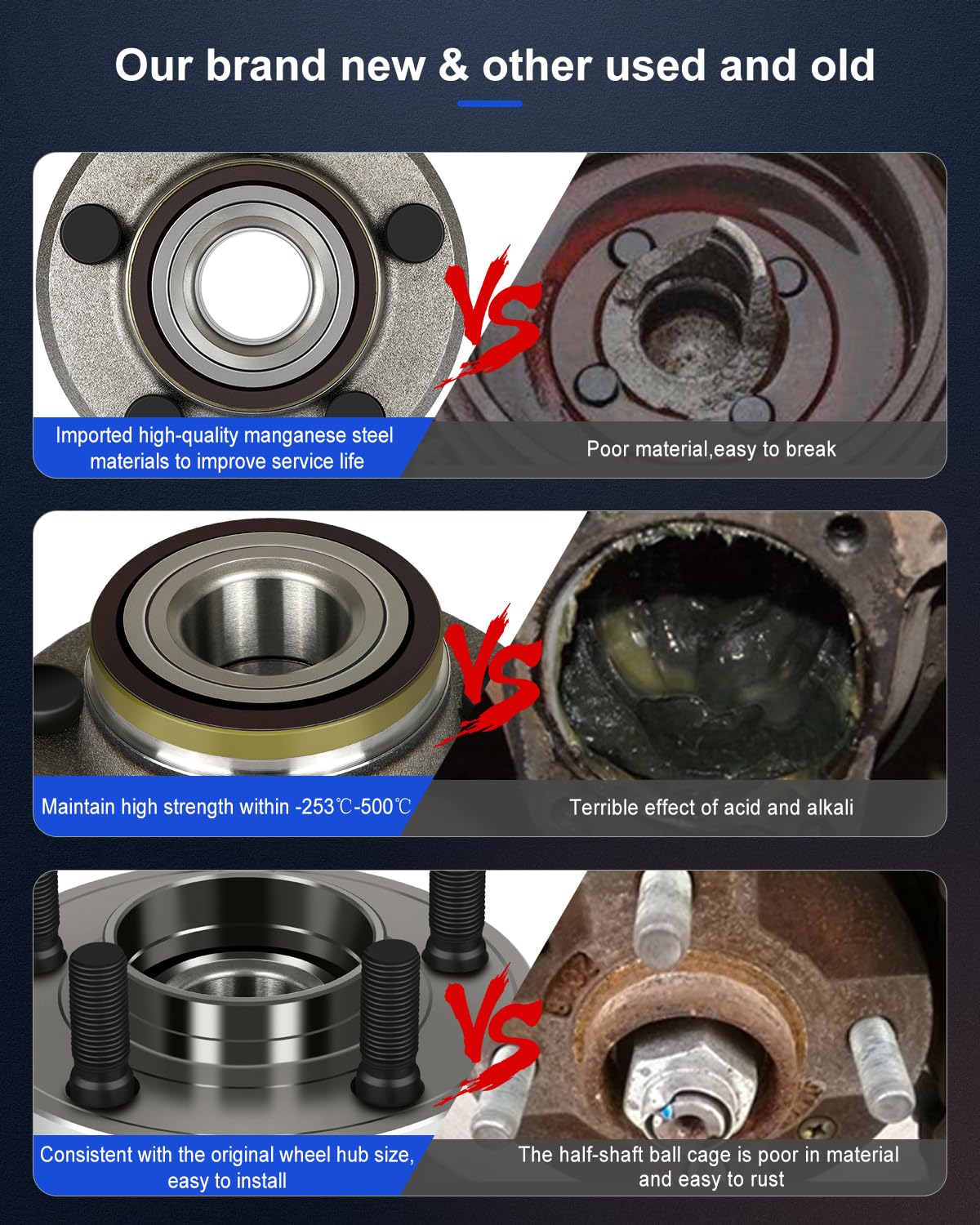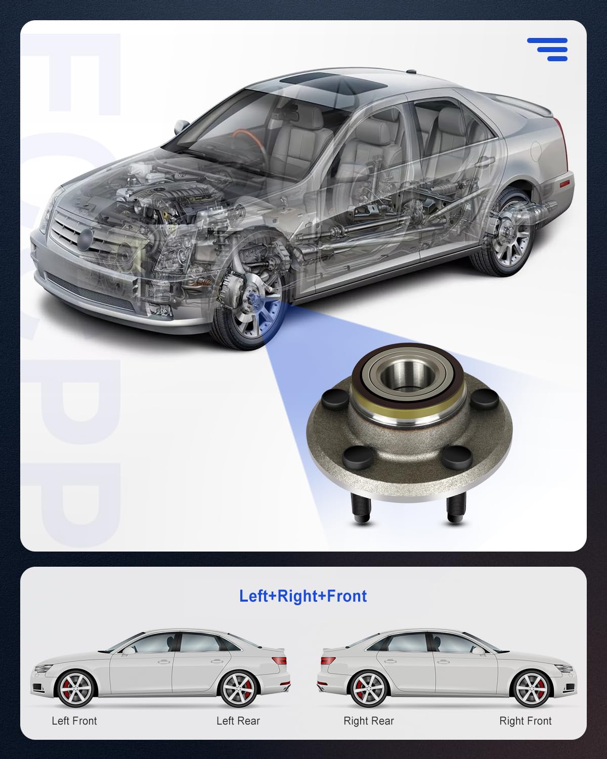 As montagens de rolamento de roda ECCPP são fabricadas com materiais de alta qualidade, garantindo compatibilidade precisa, durabilidade e desempenho superior. O design do selo de alta qualidade assegura que os rolamentos do cubo permaneçam limpos, duradouros e minimizam o ruído. Os parafusos das rodas possuem um revestimento protetor que facilita a desmontagem e a torção adequada das porcas das rodas.