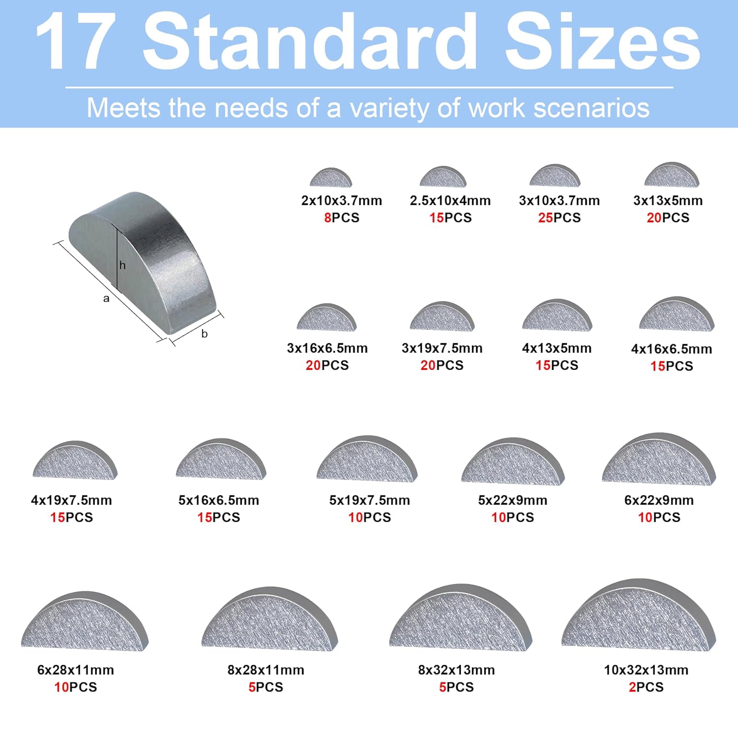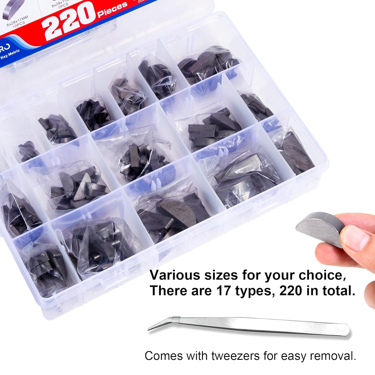 O Kit de Chaves Woodruff Metric de 220PCS é a solução ideal para profissionais e entusiastas que buscam qualidade e versatilidade em suas aplicações mecânicas. Composto por 220 peças em 17 tamanhos populares, este kit oferece uma ampla gama de chaves semicirculares, também conhecidas como chaves Woodruff, que são essenciais para a fixação e transmissão de torque em eixos rotativos e componentes. A inclusão de pinças facilita a seleção do tamanho adequado para cada tarefa, tornando o trabalho mais eficiente e preciso.