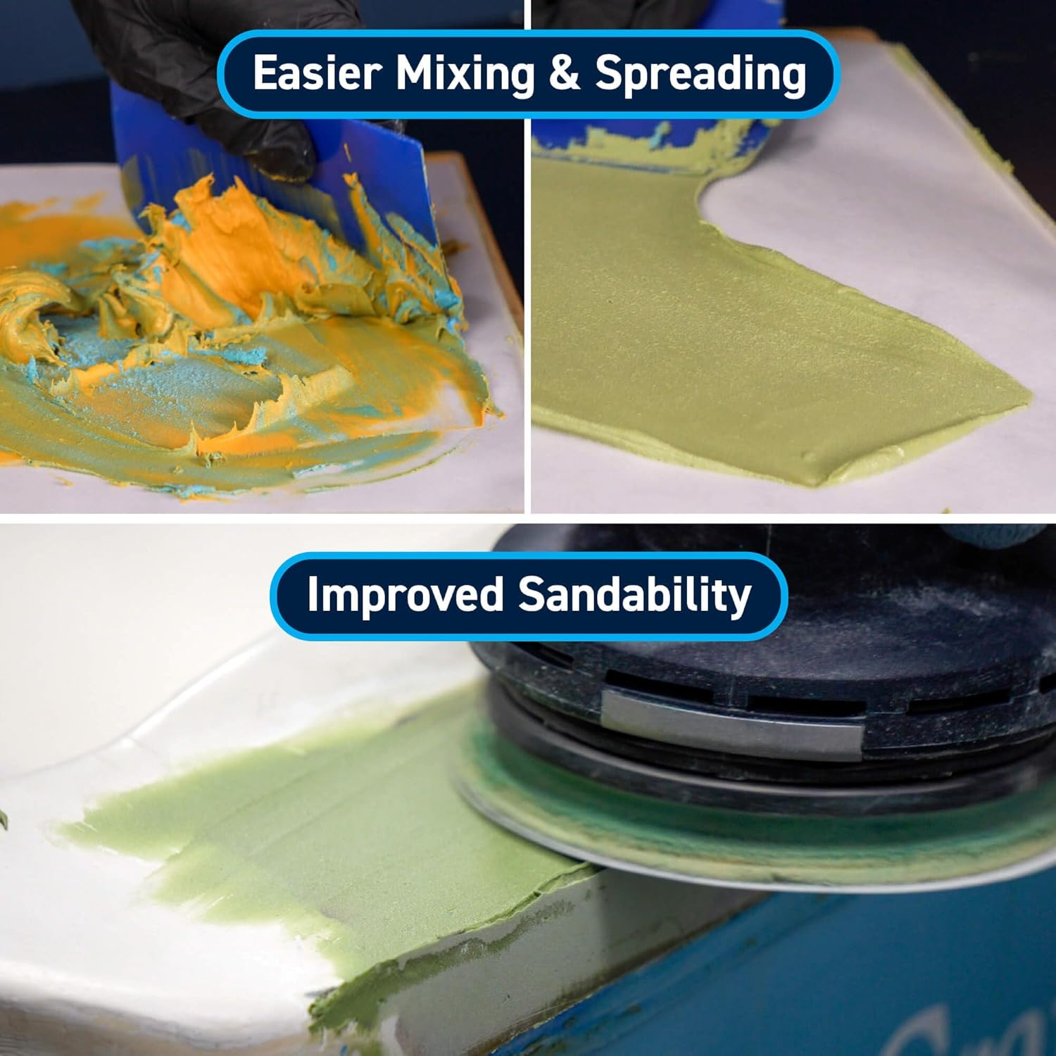 A nova fórmula melhorada do TotalFair é fácil de misturar e aplicar. Com uma proporção de mistura infalível de 1:1, basta combinar os componentes azul e amarelo até que se tornem verdes. O produto agora é mais fácil de colher, misturar, espalhar e alisar até uma borda fina, sem escorregar em superfícies verticais e superiores. O tempo de cura é rápido, permitindo que o composto esteja pronto para ser lixado em apenas 4 horas a 80°F. O TotalFair, uma vez curado, é ainda mais fácil de lixar, compatível com primers e tintas à base de látex e epóxi.