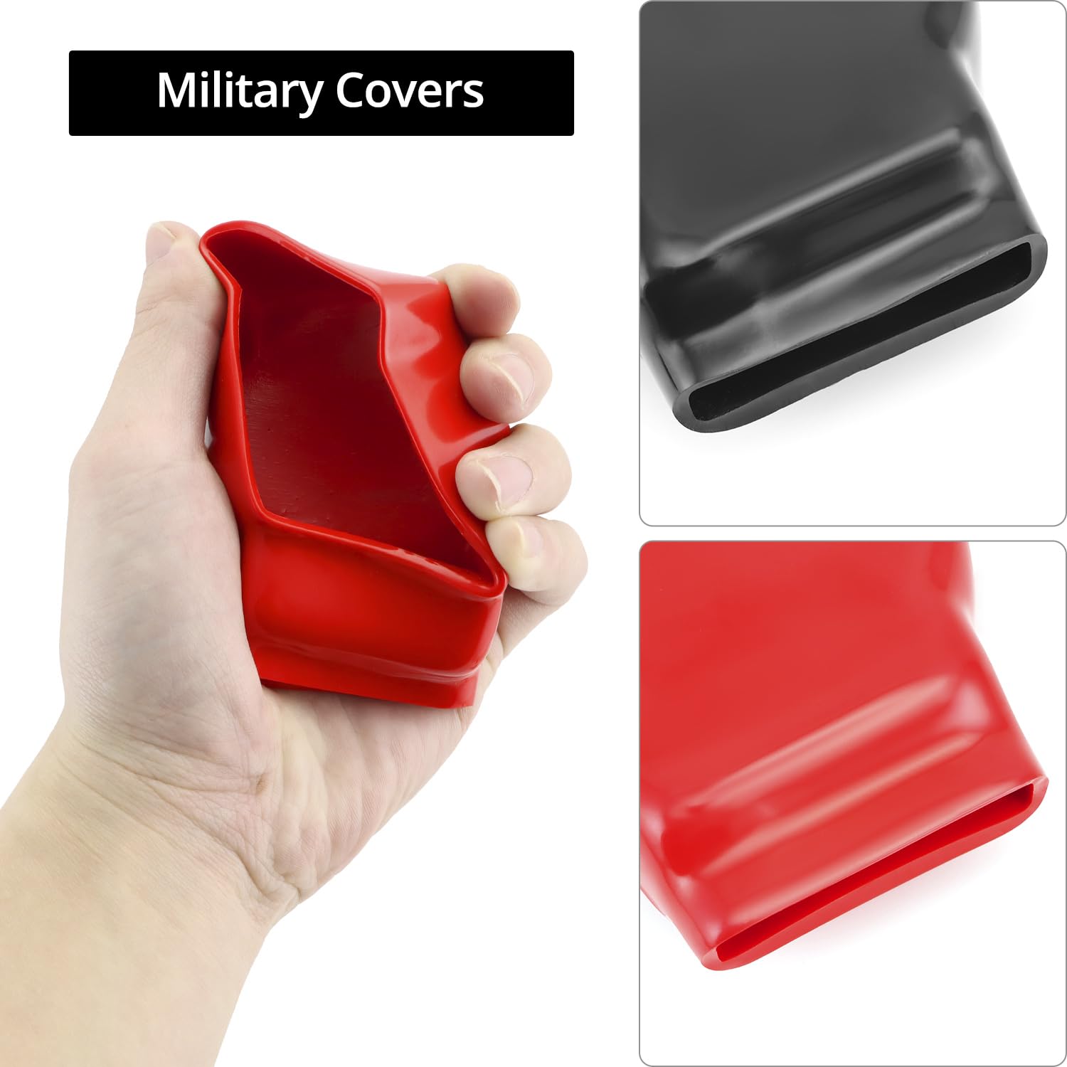 – Identificação Rápida: Capas de terminais em vermelho e preto para fácil reconhecimento da polaridade, seguindo normas militares.
