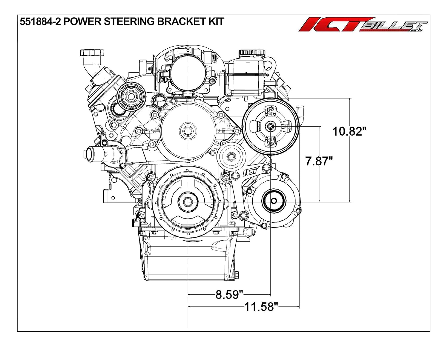 Para instalar o kit de suporte da bomba de direção hidráulica ICT Billet, comece desconectando a bateria do veículo para garantir segurança. Remova a bomba de direção antiga, se aplicável, e limpe a área de montagem. Posicione o suporte no local designado, que fica na frente da cabeça do lado do motorista, e utilize os parafusos fornecidos para fixá-lo firmemente. Em seguida, instale a bomba de direção hidráulica compatível e conecte as mangueiras de acordo com as especificações do fabricante. Após a instalação, verifique se todos os componentes estão bem fixados e reconecte a bateria.