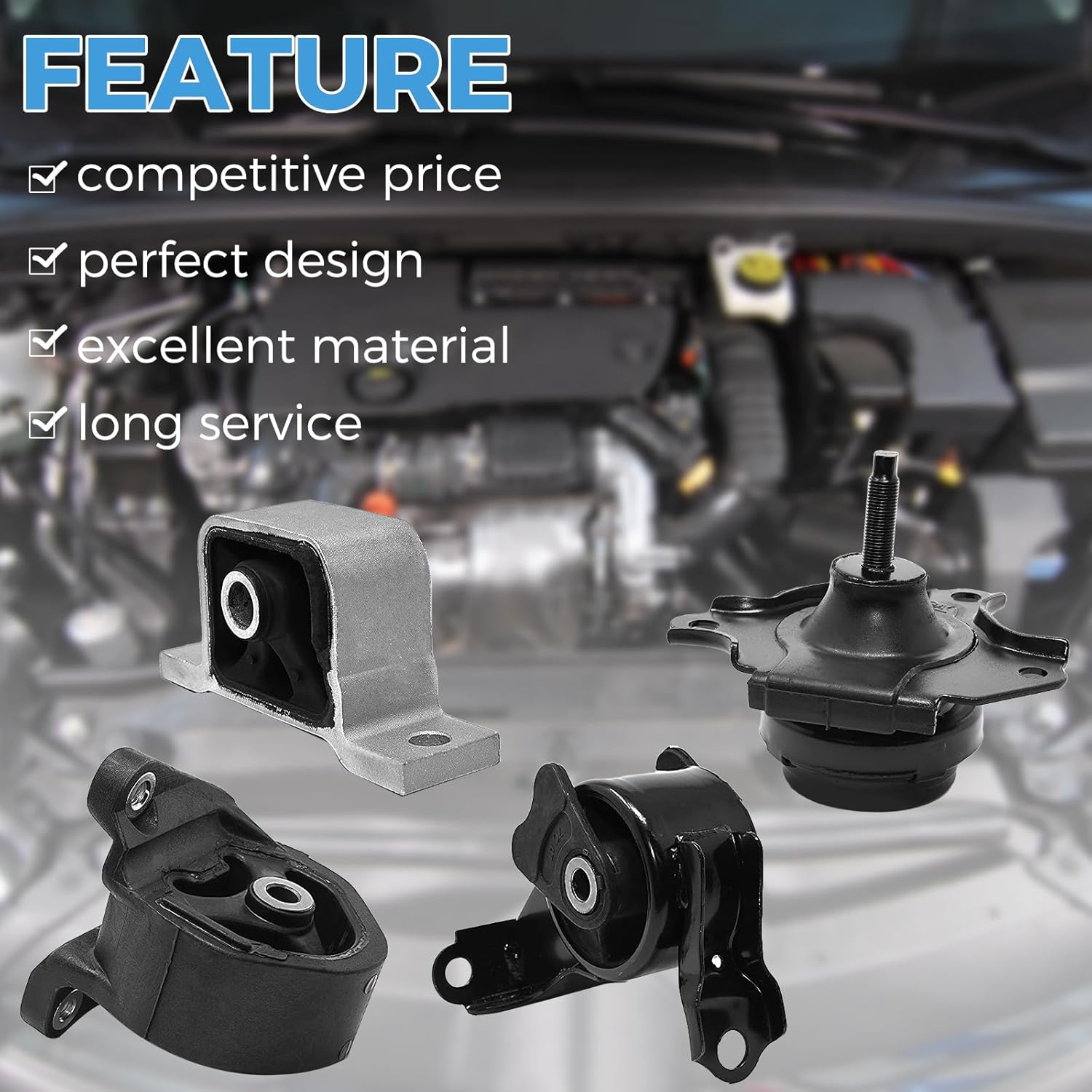 PACKAGE INCLUDE: O pacote contém quatro peças: A4504 (suporte traseiro), A4506 (suporte de transmissão), A6596 (suporte frontal direito do motor) e A6597 (suporte frontal do motor), todas projetadas para oferecer suporte robusto e confiável ao motor e à transmissão do seu veículo.