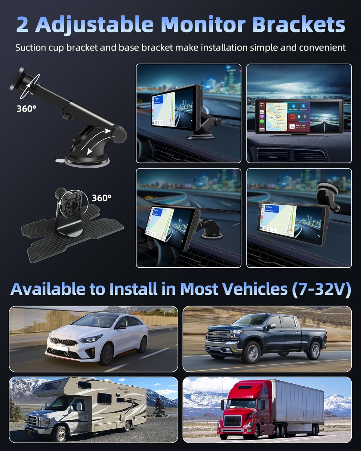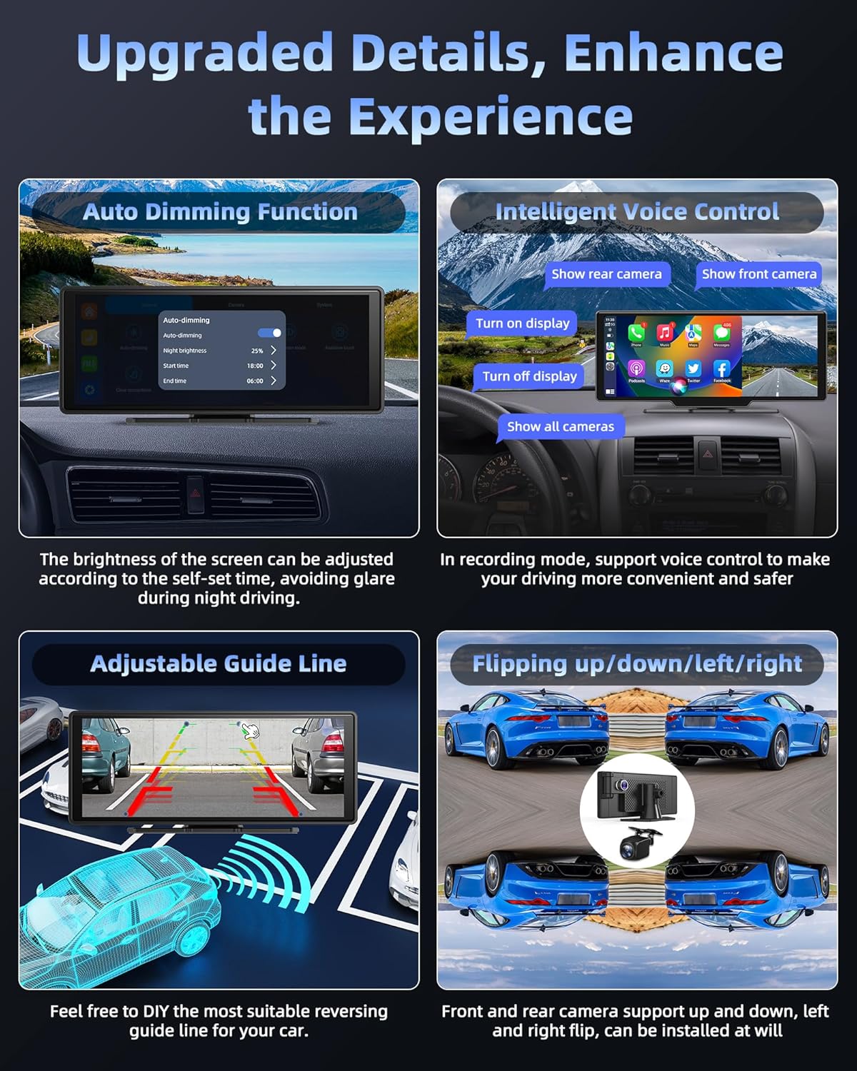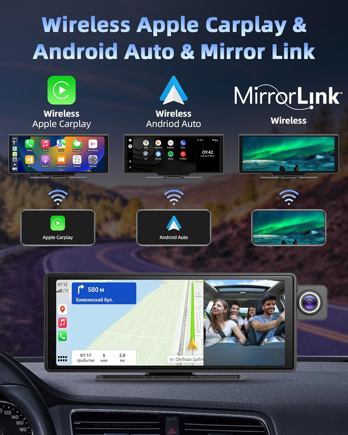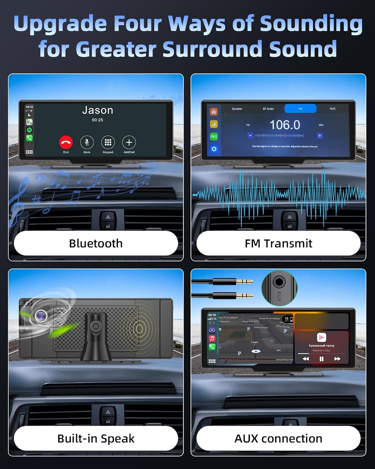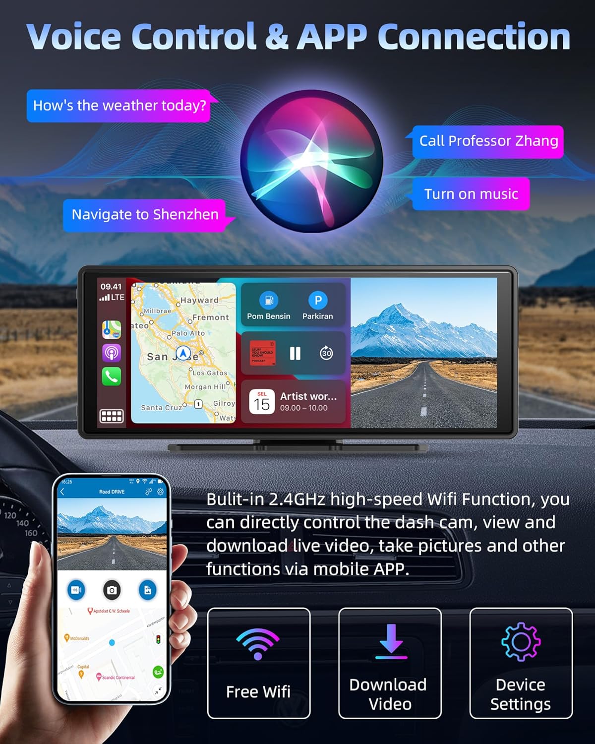 Tela Wireless CarPlay 10.26” com Câmera 2.5K e Android Auto – Estéreo Automotivo Portátil com GPS, Bluetooth, AirPlay, AUX/FM e Siri