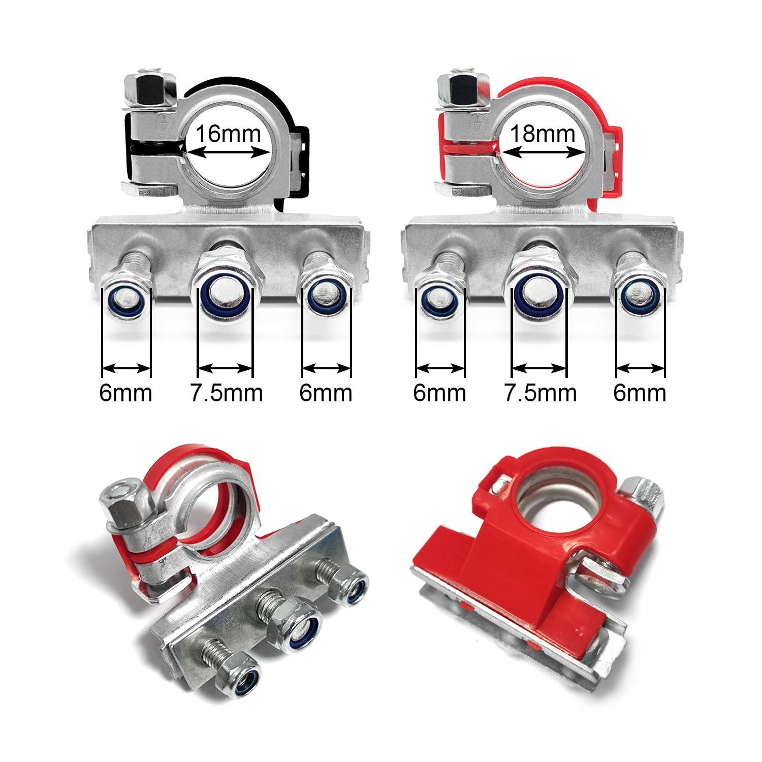 Fabricados em uma liga de alta qualidade, esses conectores não são propensos à ferrugem e garantem uma excelente condutividade elétrica. Isso significa que você pode contar com uma redução significativa na distorção de tensão e nas perdas de transmissão, resultando em um desempenho superior do seu veículo. O diâmetro do orifício positivo (vermelho) é de 18mm (0,7 polegadas) e o do orifício negativo (preto) é de 16mm (0,6 polegadas), facilitando a fiação e assegurando uma conexão robusta.