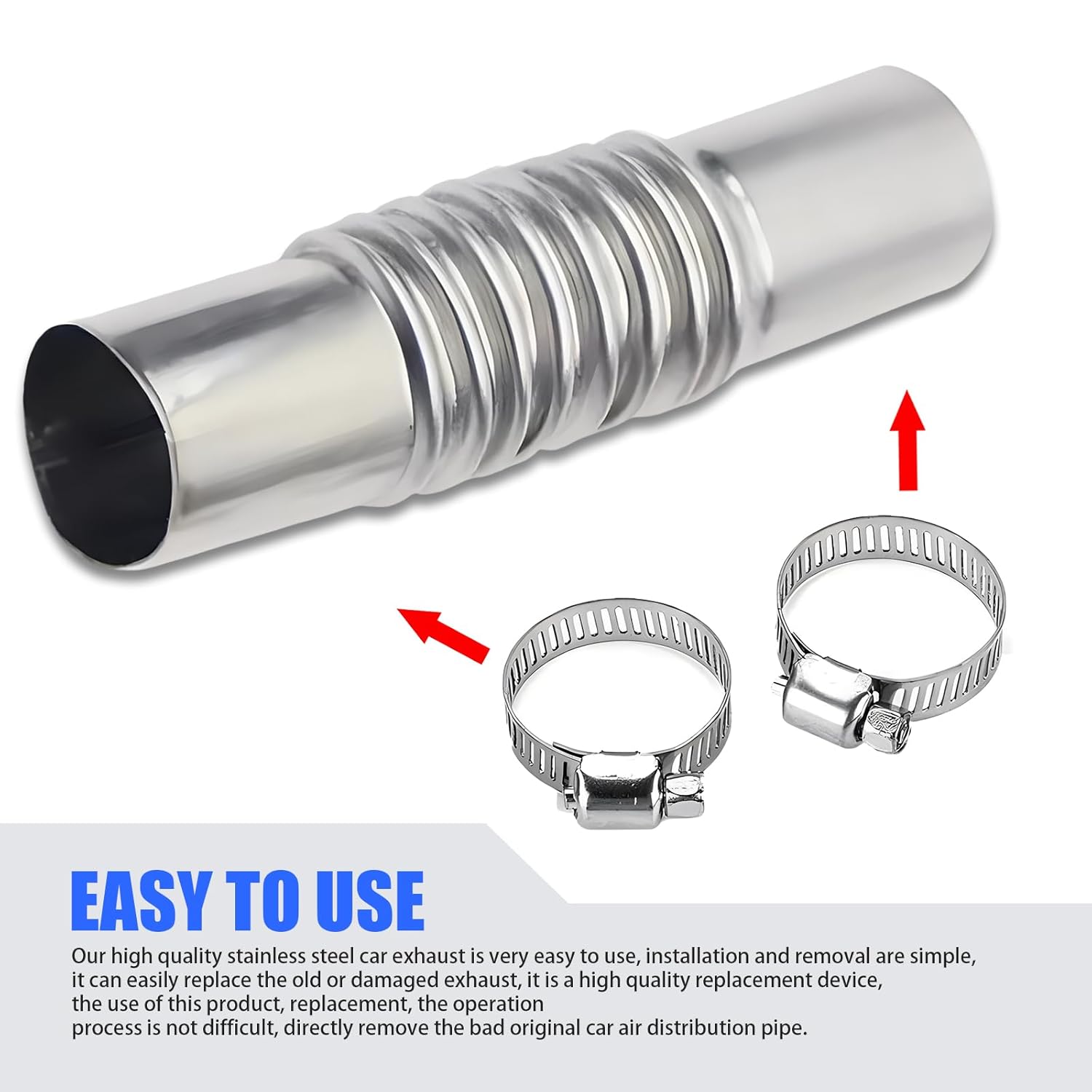 Conector de tubo de escapamento para carro, com 5,1 polegadas de comprimento, feito de metal flexível e corrugado. Inclui grampos para instalação segura. Ideal como substituição universal para sistemas de escapamento de veículos a diesel, incluindo barcos. Oferece durabilidade e resistência a altas temperaturas, garantindo um desempenho eficiente e prolongando a vida útil do sistema de escapamento. Fácil de instalar e compatível com diversas aplicações.