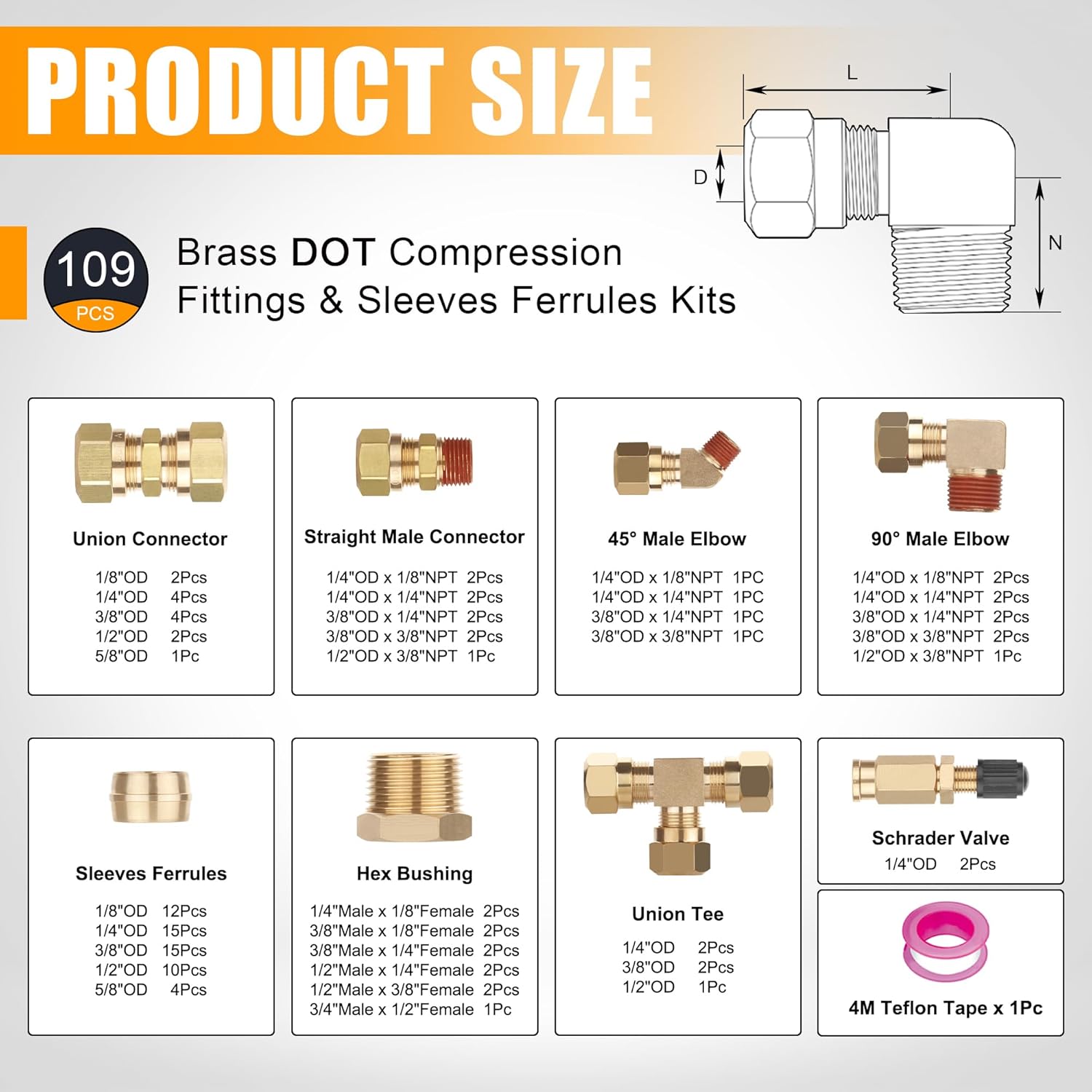 Kit de Conectores de Ar em Latão 109 Peças para Freios DOT - Fittings de Compressão 1/4″, 1/8″, 3/8″, 1/2″, 5/8″ para Tubos de Nylon - Reparos para Caminhões e Sistemas Industriais