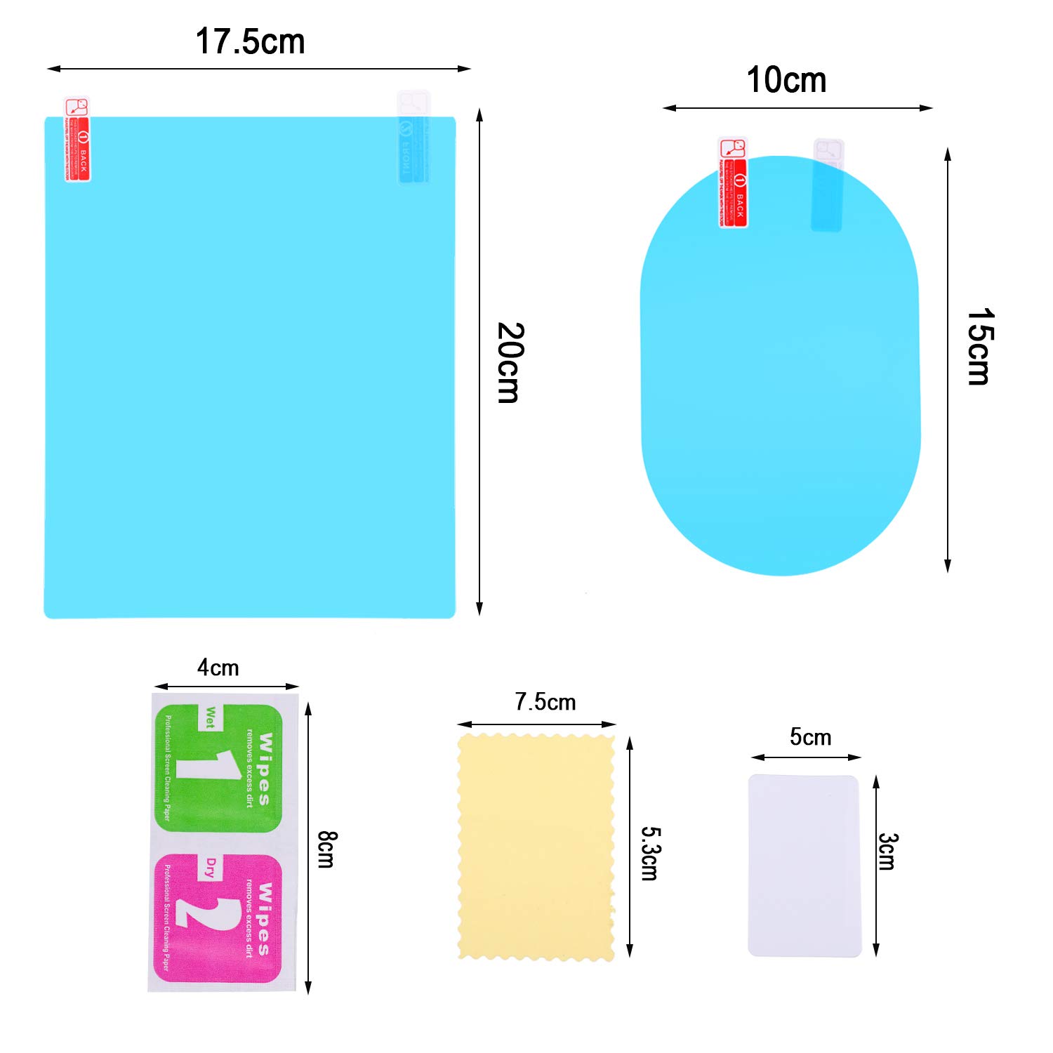 O que você recebe: O pacote contém 12 peças de filmes para espelho retrovisor em 2 tamanhos diferentes, todos com propriedades anti-neblina, anti-reflexo e anti-risco, além de serem impermeáveis e resistentes à chuva. Inclui também um kit de ferramentas com sacos de álcool, um pano amarelo para espelho e espátulas, garantindo segurança e uma visão clara.
