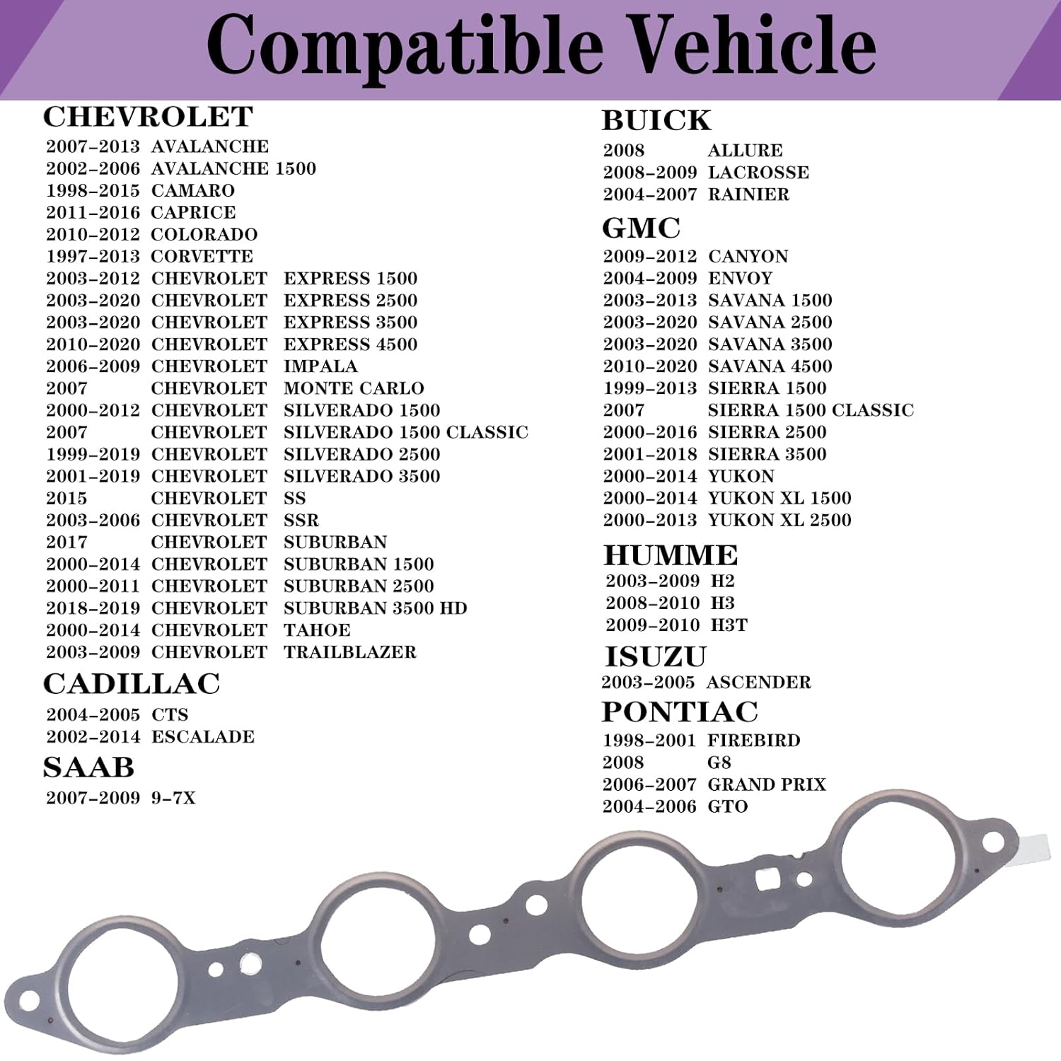 - Compatível com — Buick; Cadillac CTS, Escalade ESV, EXT; Chevrolet Avalanche 1500, Camaro, Caprice, Colorado, Corvette; Express 1500-3500; Impala LCF 3500; Monte Carlo, Silverado 1500-3500; SS, SSR, Suburban 1500-3500, Tahoe, Trailblazer EXT; Pontiac Firebird, G8, Grand Prix, GTO; GMC Canyon, Envoy XL, XUV, Savana 1500-3500; Sierra 1500, 3500; Yukon XL 1500, 2500 (00-13); Isuzu Ascender, Saab 9-7X (00-14); Hummer H2 (03-09), H3 (08-10), H3T (09-10); Pontiac Firebird (98-01), G8 (08); Grand Prix (06-07); GTO (04-06)