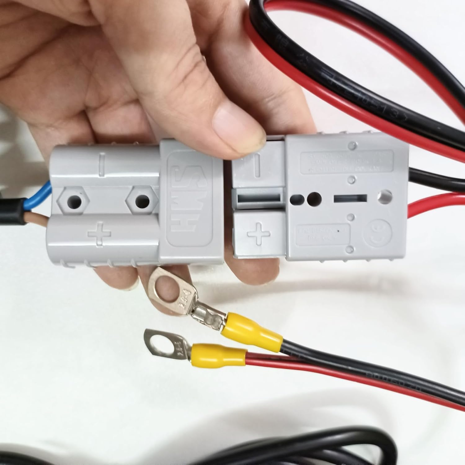 1. Conexão: Conecte o carregador à bateria utilizando o conector Anderson, assegurando que as polaridades estejam corretas (positivo com positivo e negativo com negativo).
