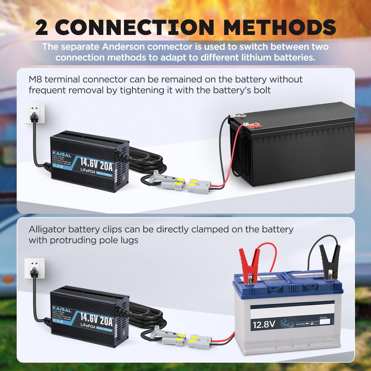 Com duas opções de conexão — terminais M8 e garras de jacaré — o carregador é extremamente versátil. O conector M8 pode ser fixado na bateria, evitando a necessidade de remoção frequente, enquanto as garras de jacaré permitem uma conexão rápida e fácil. O conector Anderson facilita a troca entre os dois métodos de conexão.