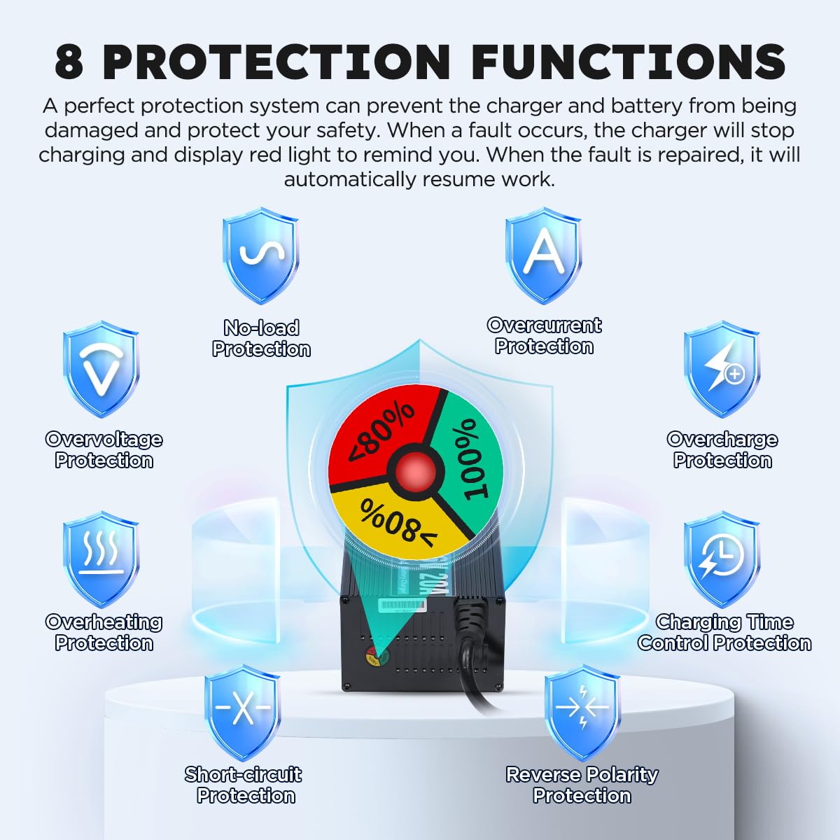 Com um sistema de proteção abrangente, o carregador possui funções de proteção contra sobrecarga, sobrecorrente, superaquecimento, falta de carga, curto-circuito, conexão reversa e temporização. Em caso de falha, o carregador interrompe automaticamente o processo de carregamento, protegendo tanto o carregador quanto a bateria. Após a correção do problema, ele retoma o funcionamento. Se o carregador operar continuamente por 15 horas, ele se desligará automaticamente para evitar danos à bateria.