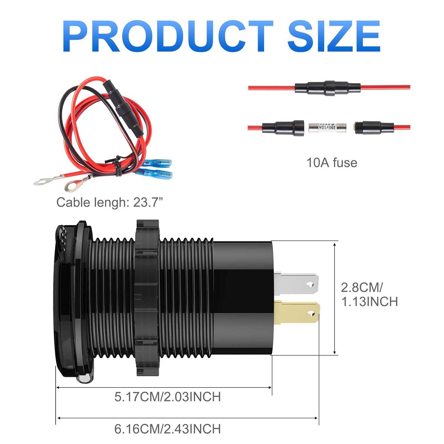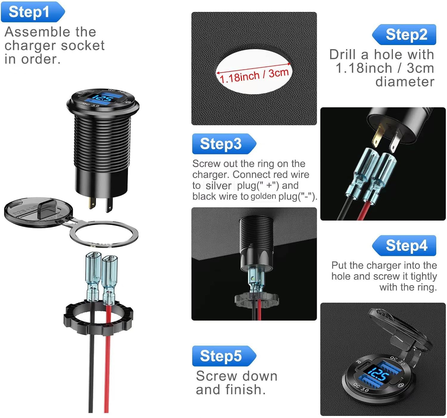 – Instalação Fácil: Você pode substituir o soquete do acendedor de cigarros original do seu carro por este carregador USB. Ou, você pode optar pela instalação DIY, perfurando um buraco de 1,18 polegadas/3 cm, inserindo o carregador e apertando o anel, e então conectando os fios positivo e negativo (fio vermelho ao plugue prateado (+), fio preto ao plugue dourado (-)). Consulte as imagens para instruções detalhadas de instalação.