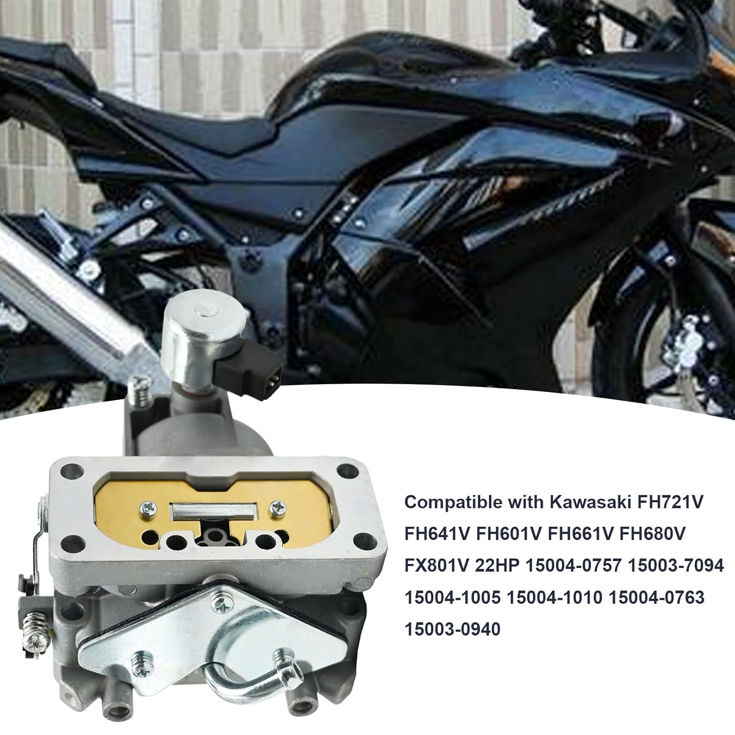 Resposta: O carburador 15004-0763 é compatível com motores Kawasaki de 22HP, incluindo os modelos FH601V, FH641V, FH661V, FH721V, FH680V, FX801V e FX850V. Verifique o número da peça original para garantir a compatibilidade.