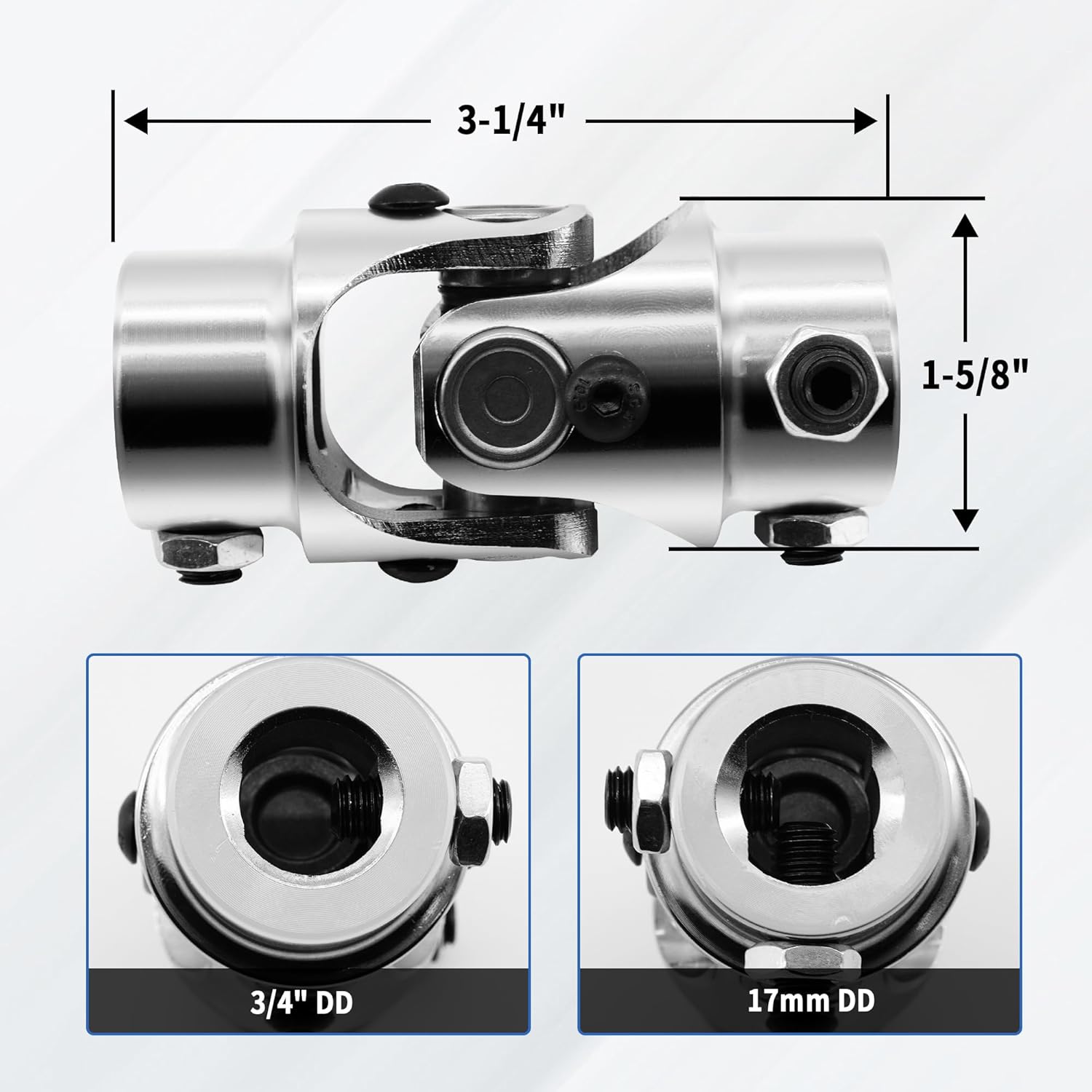 Com um comprimento total de 3-1/4″ e um diâmetro externo de 1-5/8″, esta junta é projetada para se encaixar perfeitamente em uma variedade de sistemas de direção. Um dos extremos possui um formato 17mm DD, enquanto o outro extremo é de 3/4″ DD (Double D), permitindo uma instalação fácil e rápida. A velocidade máxima de operação é de 4000rpm, tornando-a uma escolha confiável para veículos que necessitam de desempenho em alta rotação. É importante verificar o tamanho e o número de estrias em ambas as extremidades antes da compra para garantir a compatibilidade.