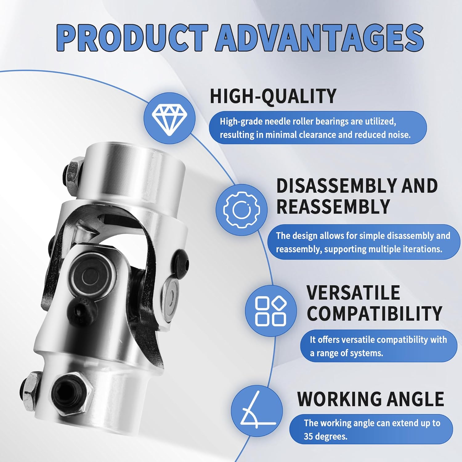 Resposta: Esta junta se destaca pelo seu material de alta qualidade (Aço Liga 4CR), acabamento em cromo polido e ângulo de trabalho máximo de 35°, oferecendo durabilidade e desempenho superior.