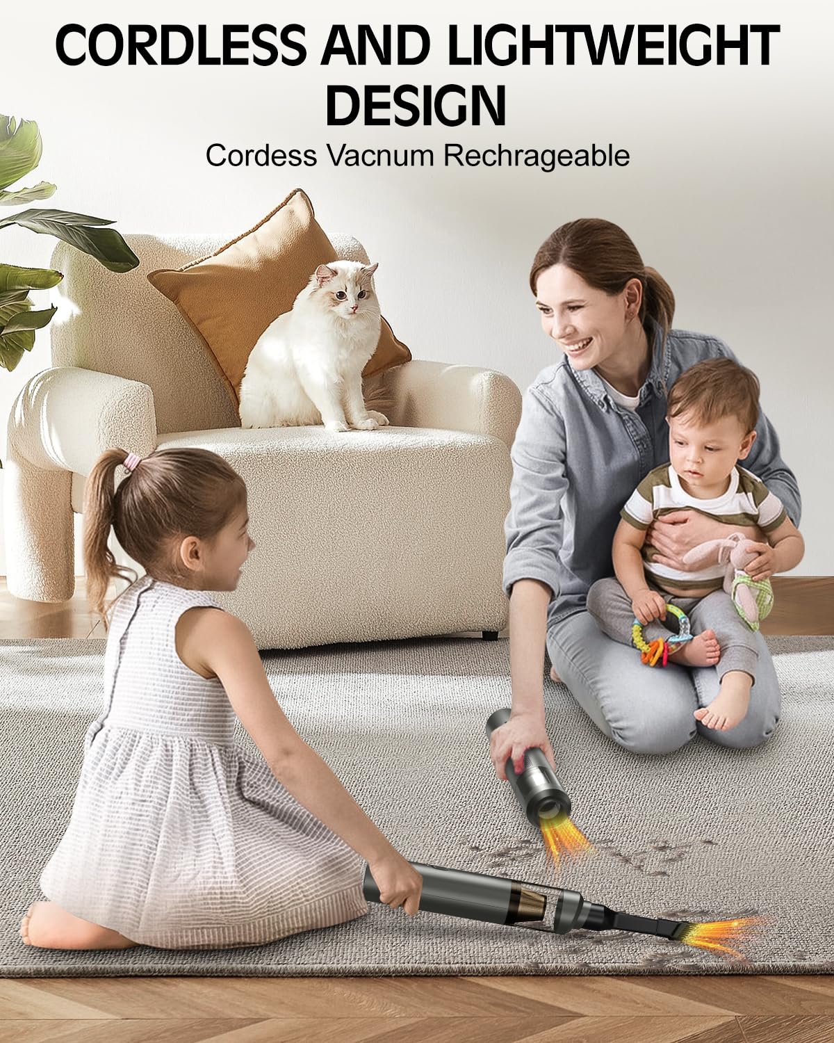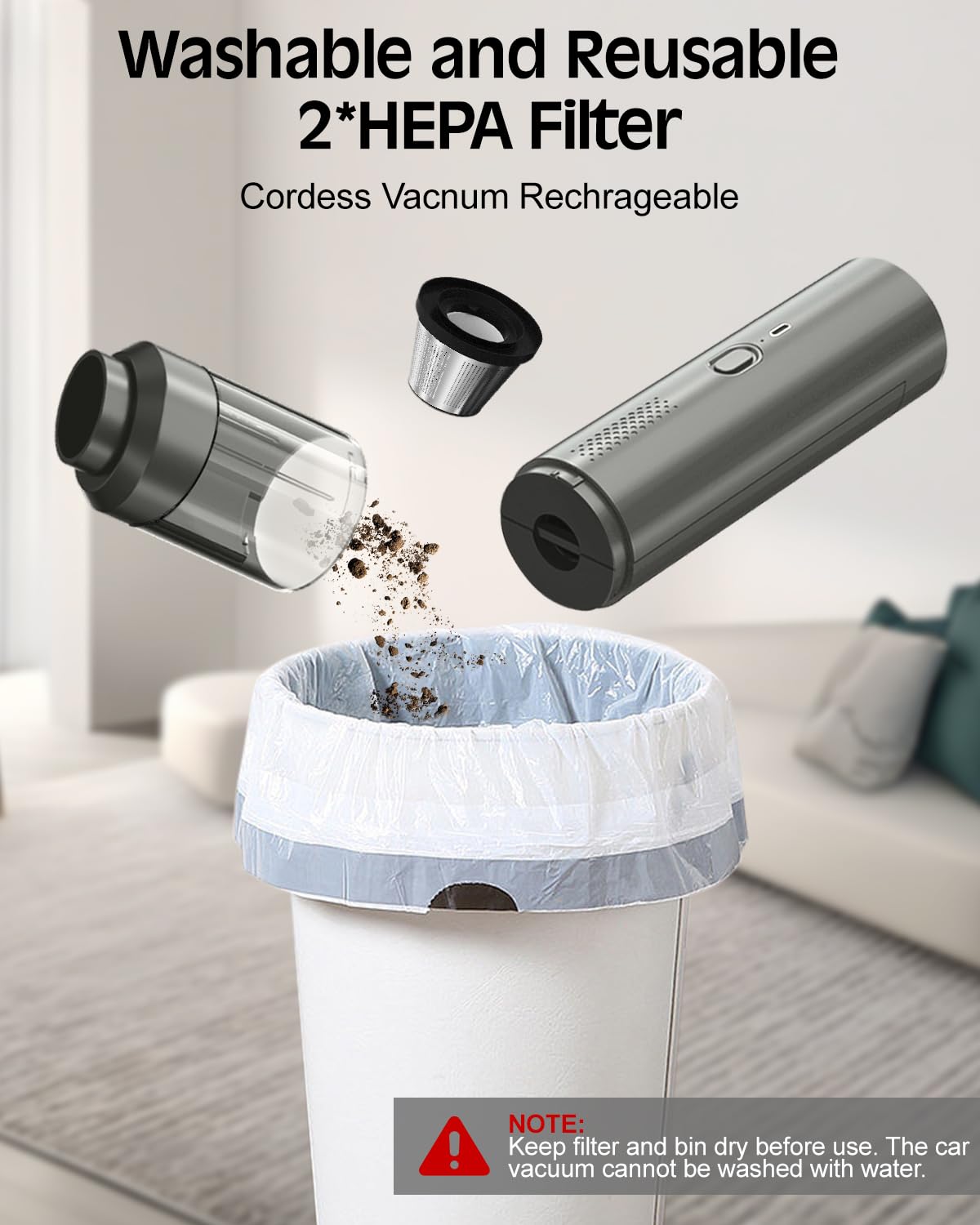 O design compacto e portátil do aspirador de pó é um dos seus grandes diferenciais. Pesando apenas 0,8 lbs e com um tamanho semelhante ao de um copo d’água, ele é confortável de segurar e vem com uma bolsa de armazenamento para facilitar o transporte. Seja em viagens de carro, bicicleta ou mochila, sua portabilidade é uma grande vantagem. O design sem fio permite que você limpe livremente o lixo em pisos, carpetes, escadas e tapetes de carro.
