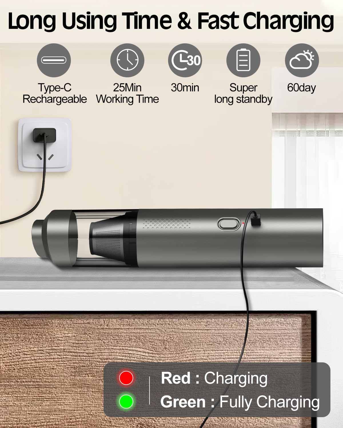 Com uma bateria de longa duração, este aspirador é alimentado por uma bateria de 4000mAh, proporcionando um suporte de energia confiável e contínuo. Após uma carga completa de 4 horas, o primeiro modo de operação pode funcionar por até 25 minutos, enquanto o segundo modo dura 15 minutos. Isso permite que você limpe todas as áreas sem interrupções, tornando-o ideal para uso em carros, casas e escritórios.