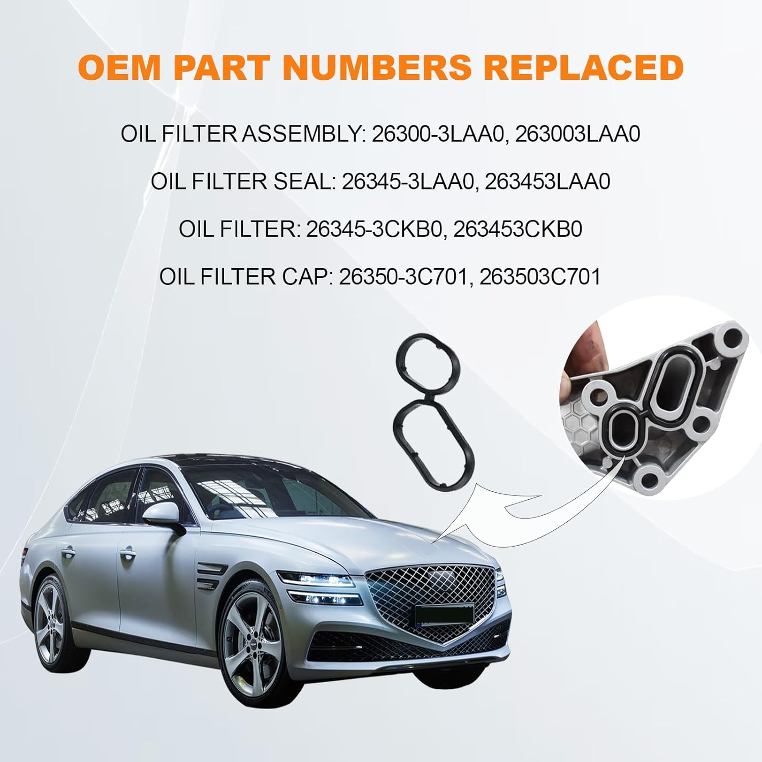 Esta gaxeta de carcaça do filtro de óleo é compatível com diversos modelos, incluindo o Kia Cadenza (2017-2020), Kia Sedona (2019-2021), Kia Sorento (2019-2020), Kia Telluride (2019-2024), além do Hyundai Genesis G80 (2017-2020), Hyundai Genesis (2016) e Hyundai Palisade (2020-2024). Os tamanhos de motor compatíveis incluem 3.3L V6 e 3.8L V6. A gaxeta é projetada para funcionar com os números de peça OEM 26345-3LAA0.