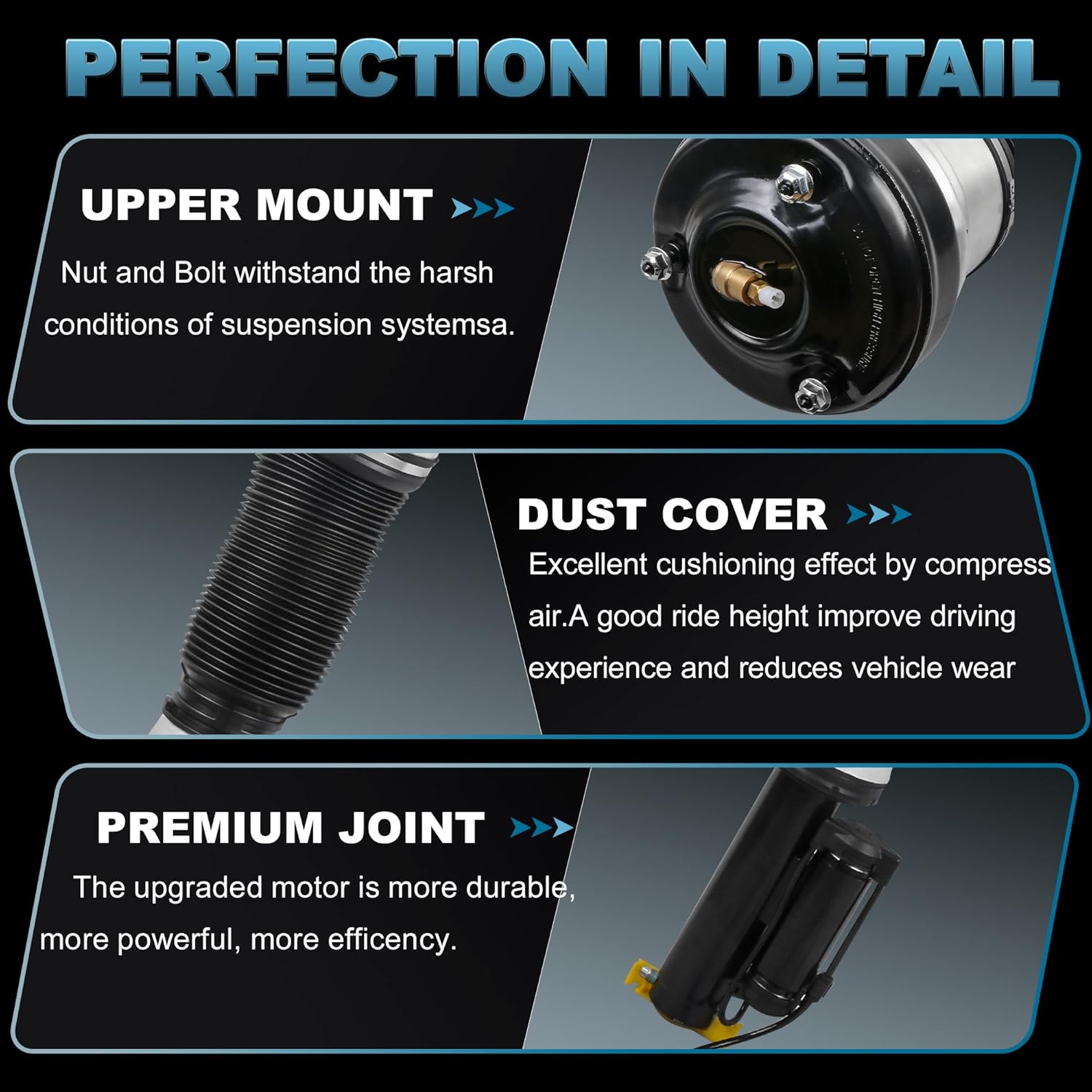 Os amortecedores são fabricados com materiais de alta qualidade, incluindo metal durável, liga de alumínio e borracha, garantindo longevidade e robustez. O design do strut de suspensão a ar mantém os níveis de altura do veículo, mesmo quando transportando cargas pesadas.