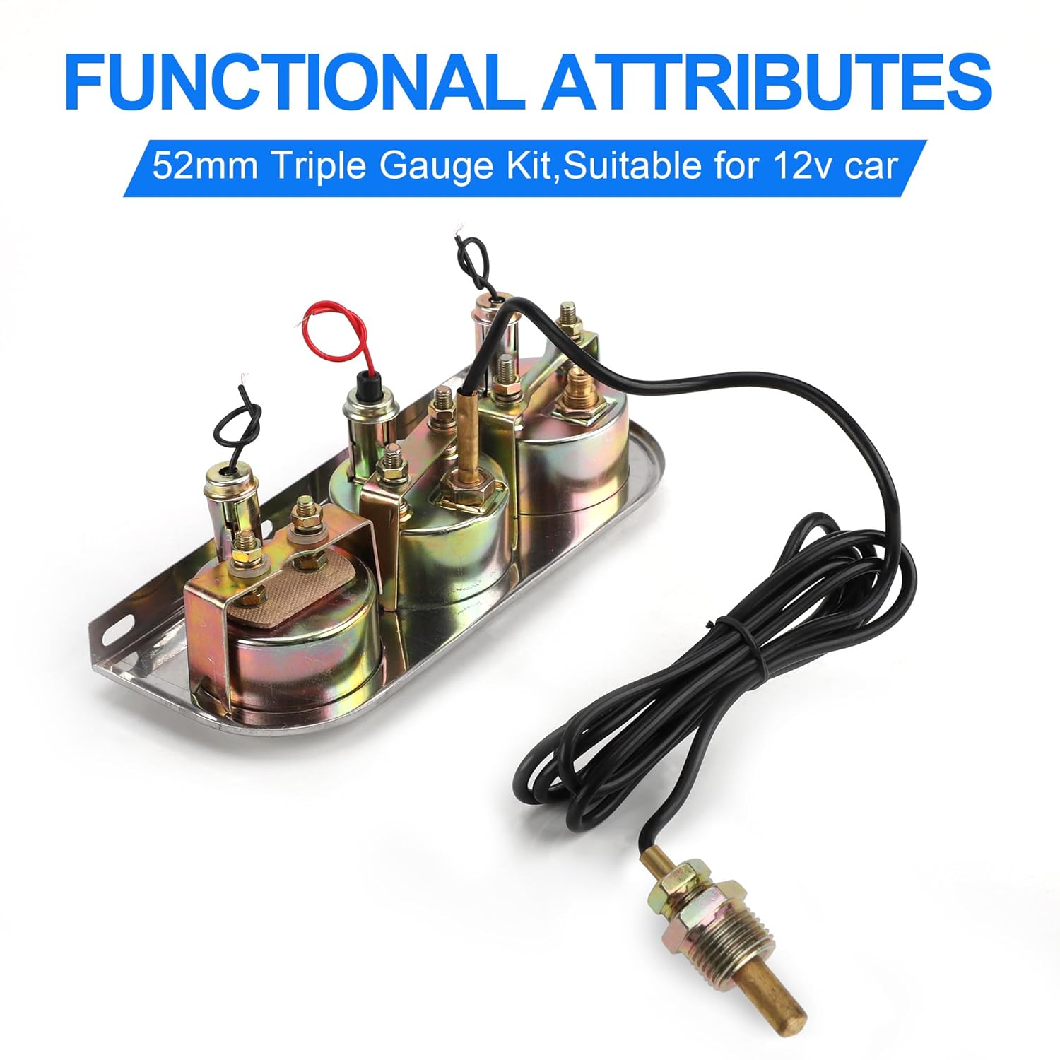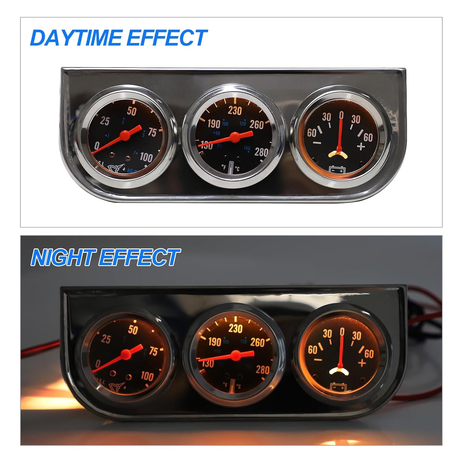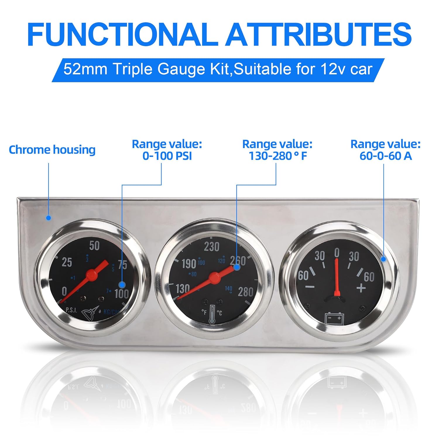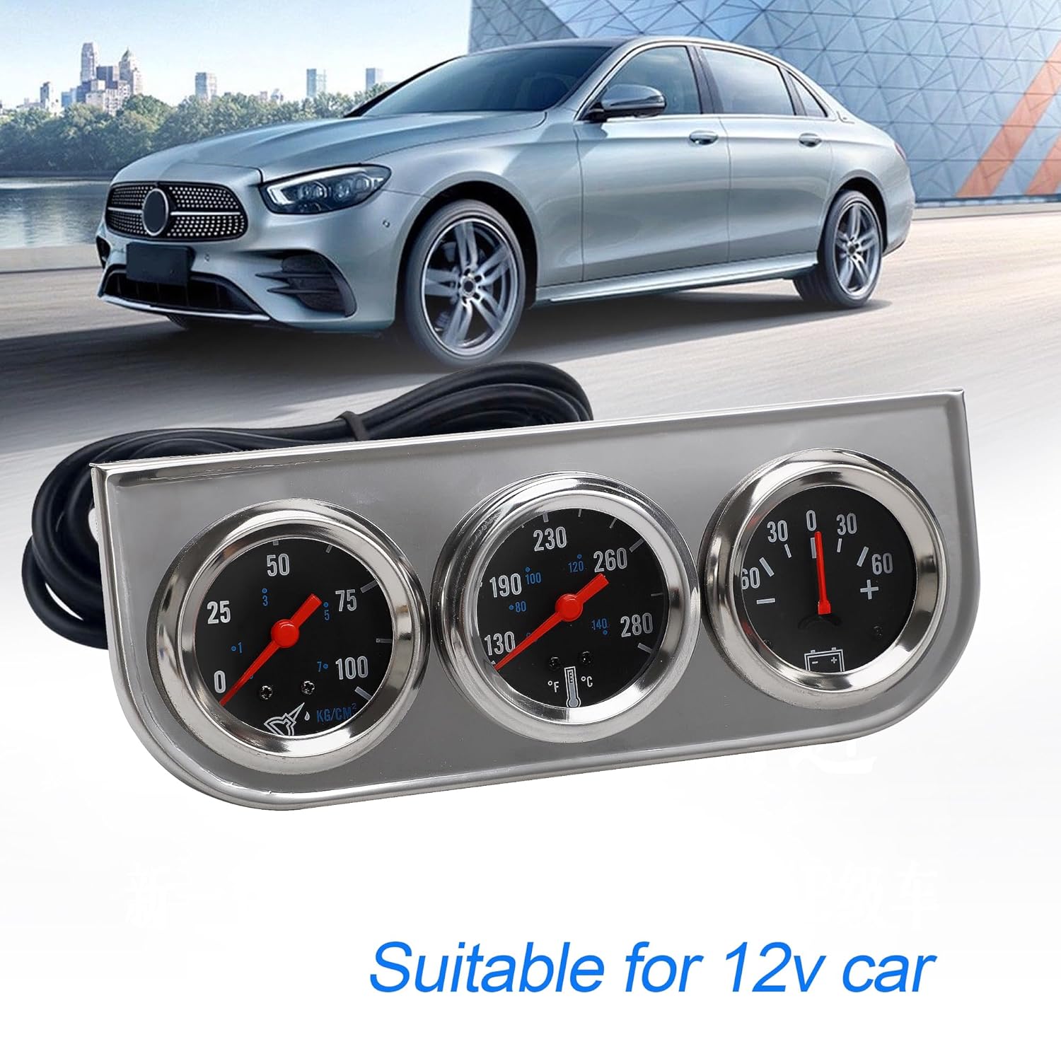 O Kit de Medidores Triplos de 2″ (52mm) com Painel Cromado 3 em 1 é a solução ideal para quem busca precisão e estilo em seu veículo. Este conjunto inclui um medidor de pressão de óleo, um medidor de temperatura da água e um amperímetro, todos projetados para veículos de 12V, como carros, barcos e caminhões. Com uma faixa de medição que varia de 0 a 100 psi para a pressão do óleo, de 130 a 280°F para a temperatura da água e de -60 a 60 AMP para o amperímetro, este kit oferece uma leitura clara e precisa das condições do seu motor.