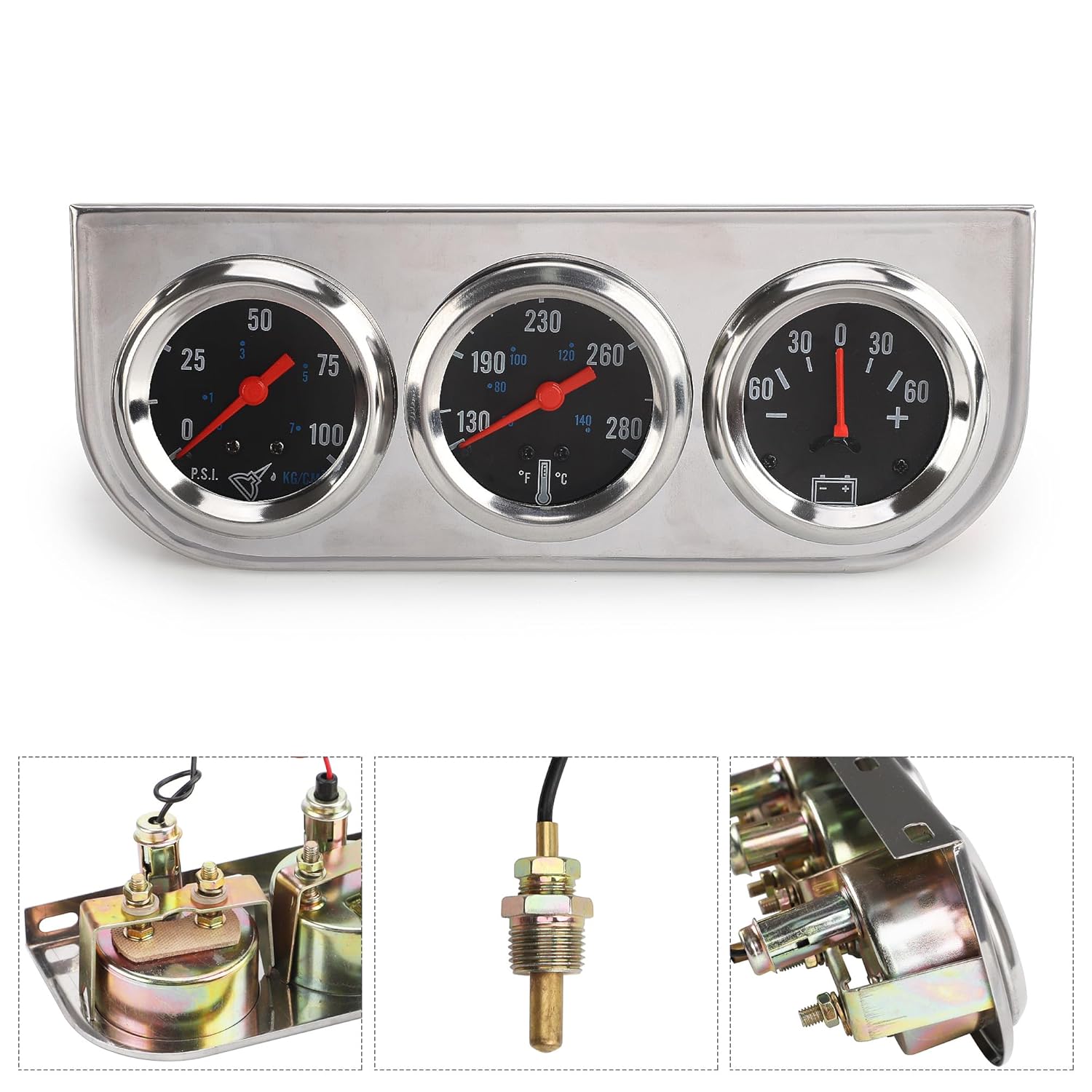 O Kit de Medidores Triplos de 2″ (52mm) com Painel Cromado 3 em 1 é a solução ideal para quem busca precisão e estilo em seu veículo. Este conjunto inclui um medidor de pressão de óleo, um medidor de temperatura da água e um amperímetro, todos projetados para veículos de 12V, como carros, barcos e caminhões. Com uma faixa de medição que varia de 0 a 100 psi para a pressão do óleo, de 130 a 280°F para a temperatura da água e de -60 a 60 AMP para o amperímetro, este kit oferece uma leitura clara e precisa das condições do seu motor.