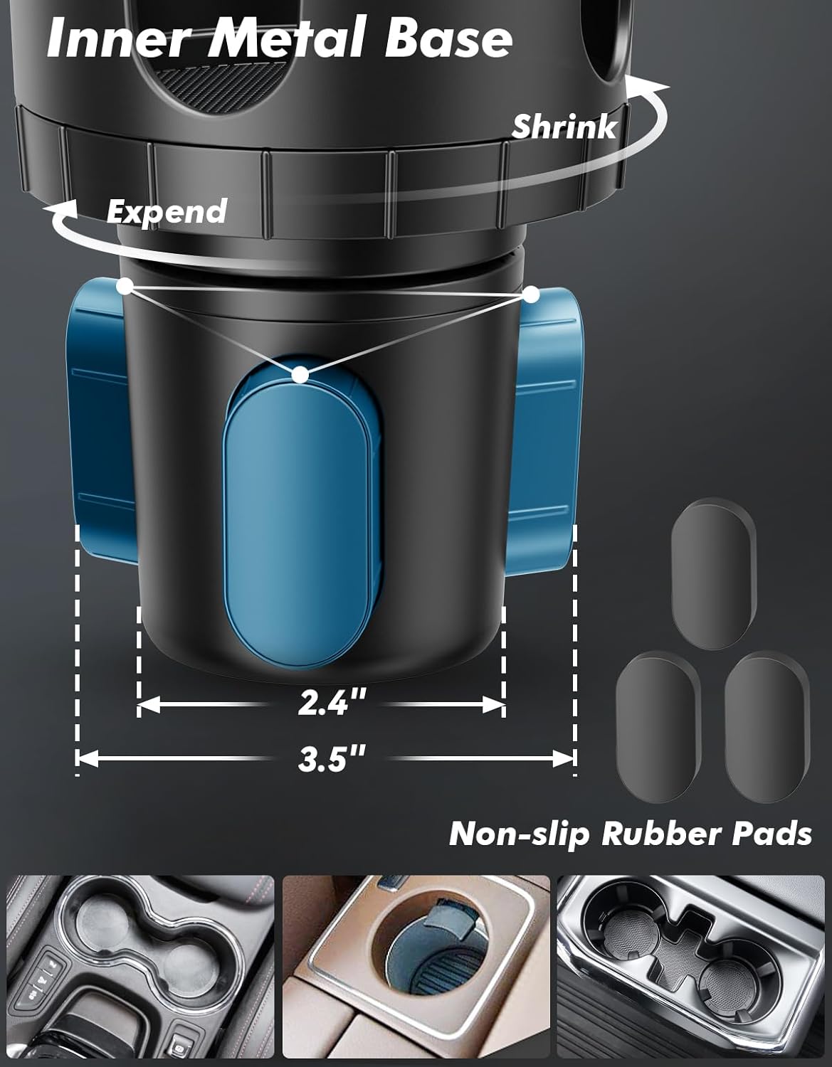– Base Super Estável e Expansível: A base do suporte pode ser ajustada de 2,4″ a 4,8″ com um simples giro do botão, garantindo que se encaixe na maioria dos porta-copos. Sua construção robusta evita tremores e oscilações durante a condução.