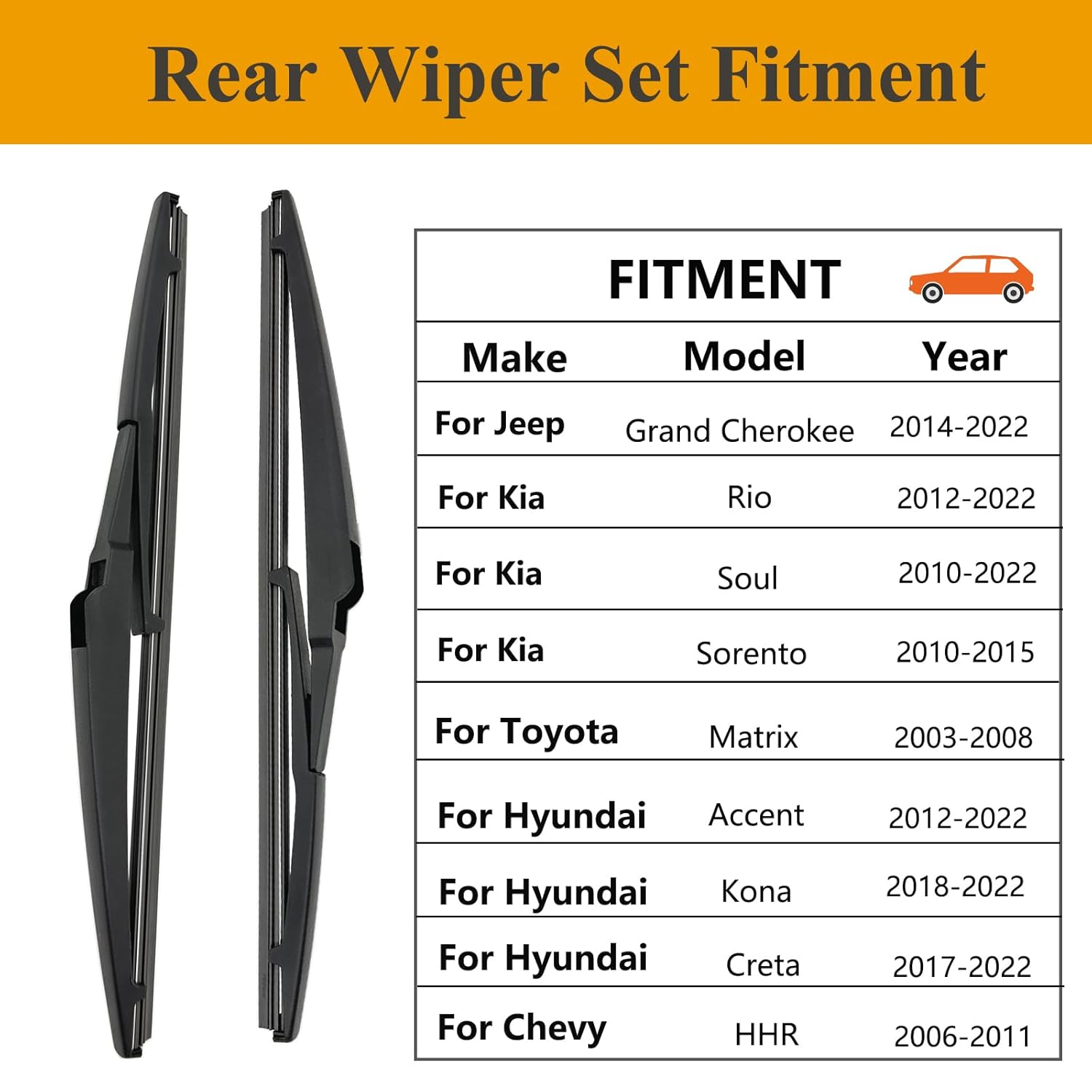 Fitment: As lâminas de limpador traseiro são compatíveis com uma ampla gama de veículos, incluindo Jeep Grand Cherokee (2014-2022), Kia Rio (2012-2022), Kia Rondo (2014-2016), Kia Sorento (2010-2015), Kia Soul (2010-2019), Pontiac Vibe (2003-2010), Scion iQ (2012-2015), Chevy HHR (2006-2011), Hyundai Accent (2012-2022), Hyundai Creta (2017-2022), Hyundai Kona (2018-2022), Toyota Prius V (2012-2019) e Toyota Matrix (2003-2008).