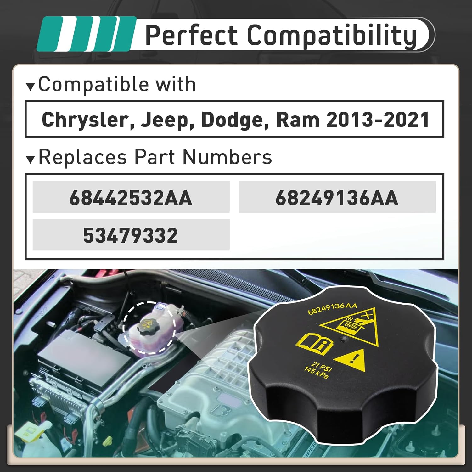 Compatibilidade e Substituição: Este capô de reservatório de fluido de radiador é compatível com uma ampla gama de modelos, incluindo Chrysler 200 (2015-2017), Chrysler Pacifica (2017-2021), Chrysler Voyager (2020-2021), Dodge Dart (2013-2016), Dodge Durango (2016-2021), Dodge Neon (2017), Jeep Cherokee (2014-2021), Jeep Compass (2017-2021), Jeep Gladiator (2020-2021), Jeep Grand Cherokee (2016-2020), Jeep Renegade (2015-2021), Jeep Wrangler (2018-2021), e diversos modelos da linha Ram, como 1500 (2014-2021), 2500/3500 (2013-2021), 4500/5500 (2013-2018) e Ram 1500 Classic (2019).