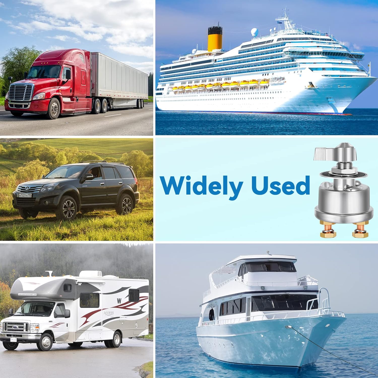 Este interruptor de corte de bateria é amplamente aplicável, podendo ser utilizado em diversas situações, como em RVs, barcos, carros, trailers, caminhões, ATVs e outros veículos. Ele permite desconectar a bateria quando não estiver em uso, prevenindo o desgaste da bateria e garantindo que você não tenha surpresas desagradáveis ao tentar ligar seu veículo.