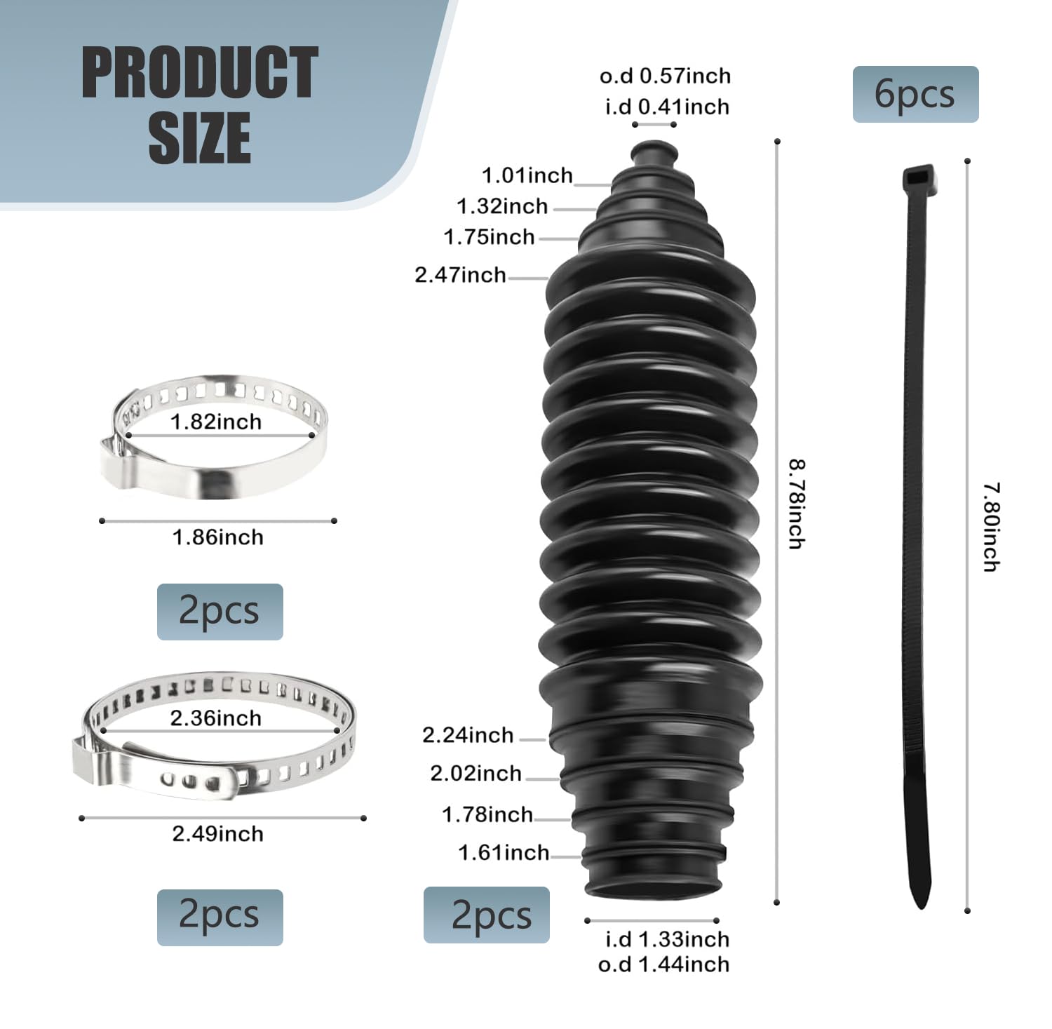 Kit de Capa de Poeira para Direção de Carro (2 PCS) com 8,78″ de comprimento, inclui capa de direção não destacável, 7,8″ de braçadeira e 2,49″ de clipe. Ideal para substituição e modificação, oferece proteção eficaz contra sujeira e detritos, aumentando a durabilidade do sistema de direção. Fácil de instalar, garante um ajuste seguro e confiável, melhorando o desempenho do veículo. Perfeito para quem busca manutenção e aprimoramento na direção do carro.