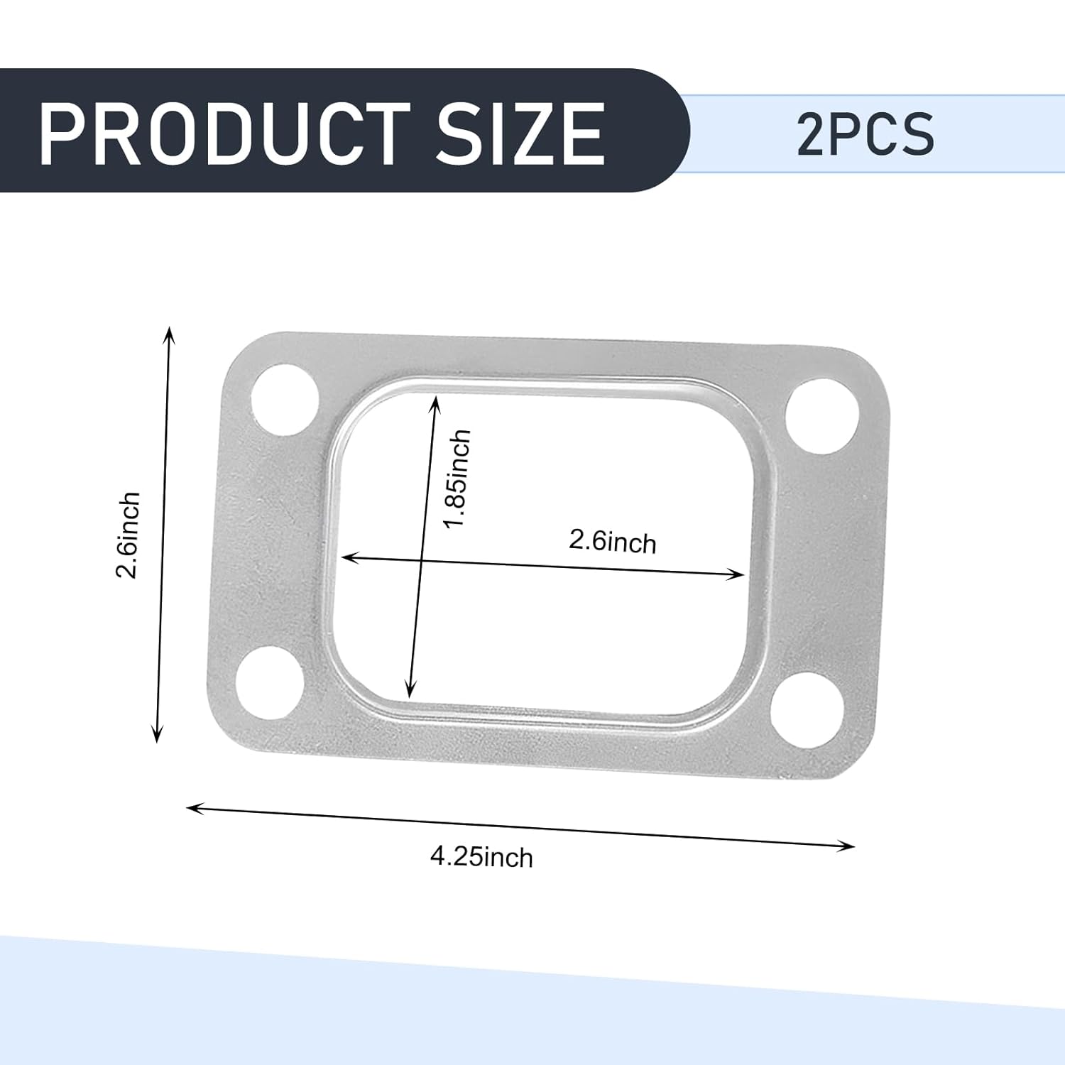 Aumente a eficiência do seu motor com o nosso conjunto de gaxetas de flange de entrada turbo, projetadas especificamente para veículos equipados com turbocompressores T3, T34, T35, T38, GT35 e GT35R. Este pacote inclui duas gaxetas de flange de turbina com um design de quatro furos, medindo 4,25″ x 2,6″ no tamanho total e 2,6″ x 1,85″ no tamanho interno. A construção em aço inoxidável garante resistência a altas temperaturas, evitando deformações e danos que podem comprometer o desempenho do seu motor.
