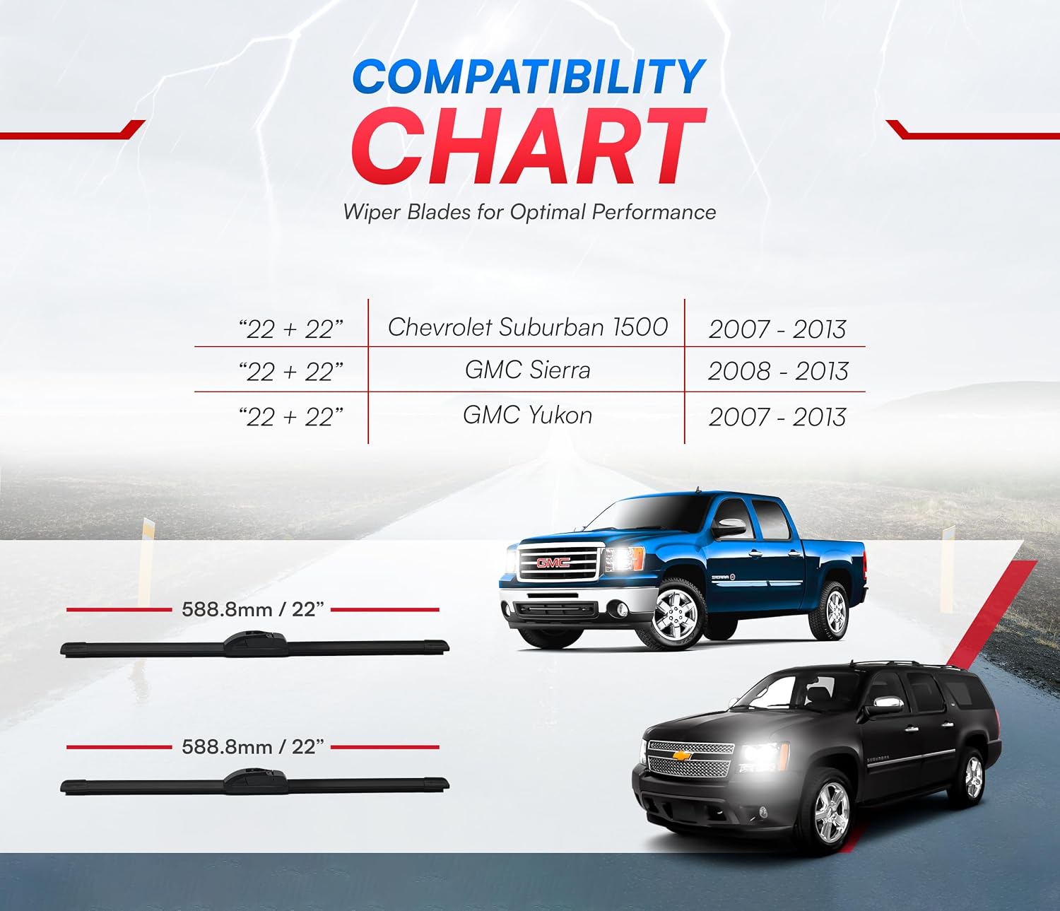 As lâminas de limpador de para-brisa de 22″ são a escolha ideal para quem possui um GMC Sierra (2008-2013), Chevy Suburban (2007-2013) ou GMC Yukon (2007-2013). Com a tecnologia CLEARMAX 365, essas lâminas oferecem desempenho superior em todas as condições climáticas, resistindo a rachaduras e desbotamento por UV. Mesmo em temperaturas extremas, a flexibilidade das lâminas é mantida, garantindo durabilidade e eficiência em cada uso.