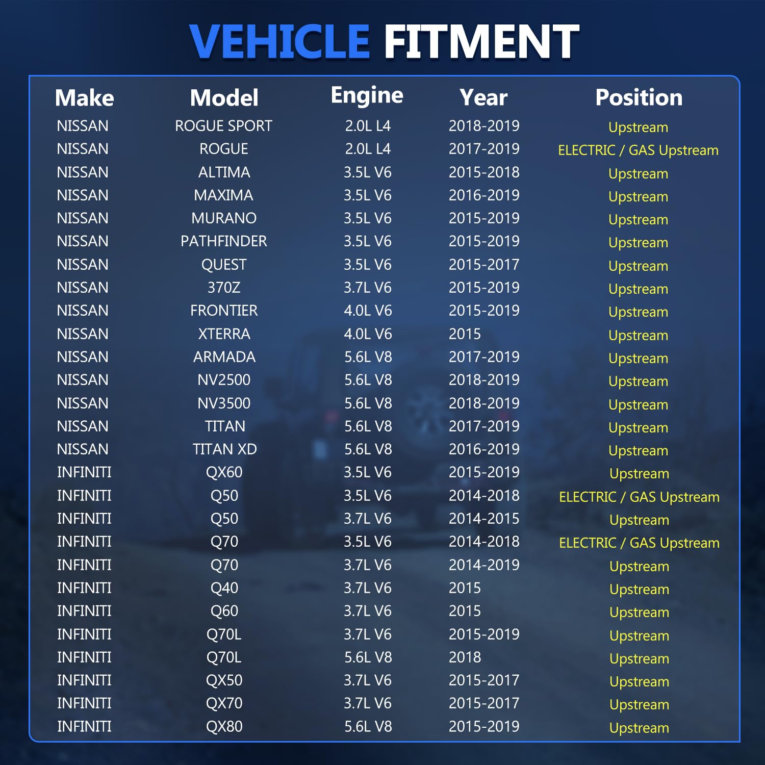 - 🔧【Aplicações】Compatível com Nissan 2018-2019 Rogue Sport 2.0L, 2017-2019 Rogue 2.0L Electric Gas, 2015-2018 Altima 3.5L, 2016-2019 Maxima 3.5L, 2015-2019 Murano Pathfinder 3.5L, 2015-2017 Quest 3.5L, 2015-2019 370Z 3.7L, 2015-2019 Frontier 4.0L, 2015 Xterra 4.0L, 2017-2019 Armada 5.6L, 2018-2019 NV2500 NV3500 5.6L, 2017-2019 Titan 5.6L, 2016-2019 Titan XD 5.6L.