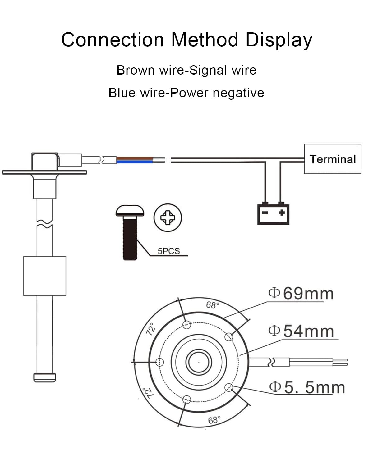 O pacote inclui 1 unidade de envio de combustível, 1 junta NBR e 5 parafusos M5. É fundamental selecionar o comprimento e a faixa de resolução corretos da unidade de envio. Conecte o fio de terra do transmissor (azul) à conexão de terra comum e o fio de sinal do transmissor (marrom) à conexão do medidor. Se o seu medidor tiver uma conexão codificada por cores, mantenha essa codificação ao conectar os fios do transmissor e da terra.