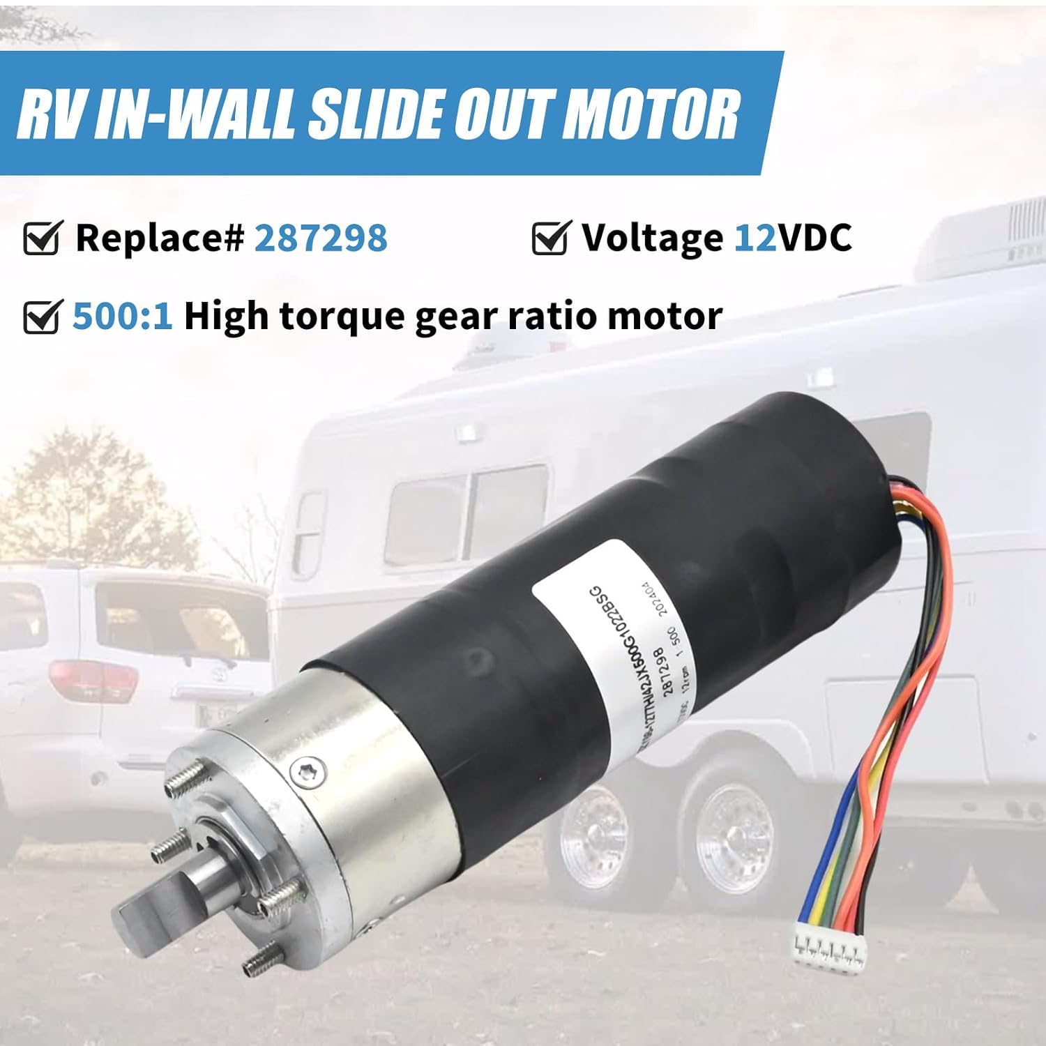 – Número da Peça de Substituição: 500:1 RV In-Wall Slide-Out Motor, substitui o número de peça 287298 e 300:1 RV In-Wall Slide-Out Motor, substitui o número de peça 236575.