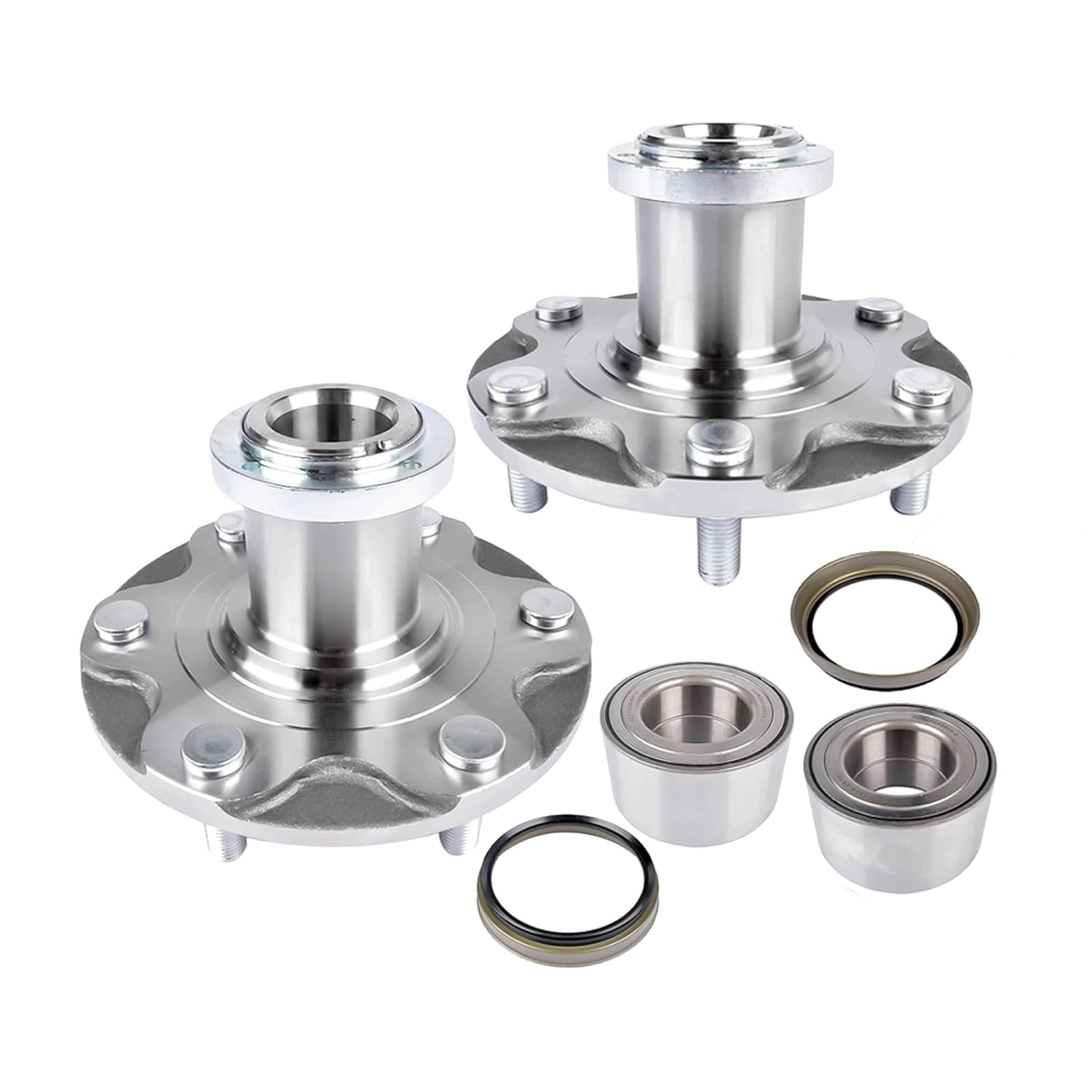 Resposta: O kit inclui 2 rolamentos de roda dianteira, 2 cubos de roda dianteira, 2 porcas de travamento e 2 selos.