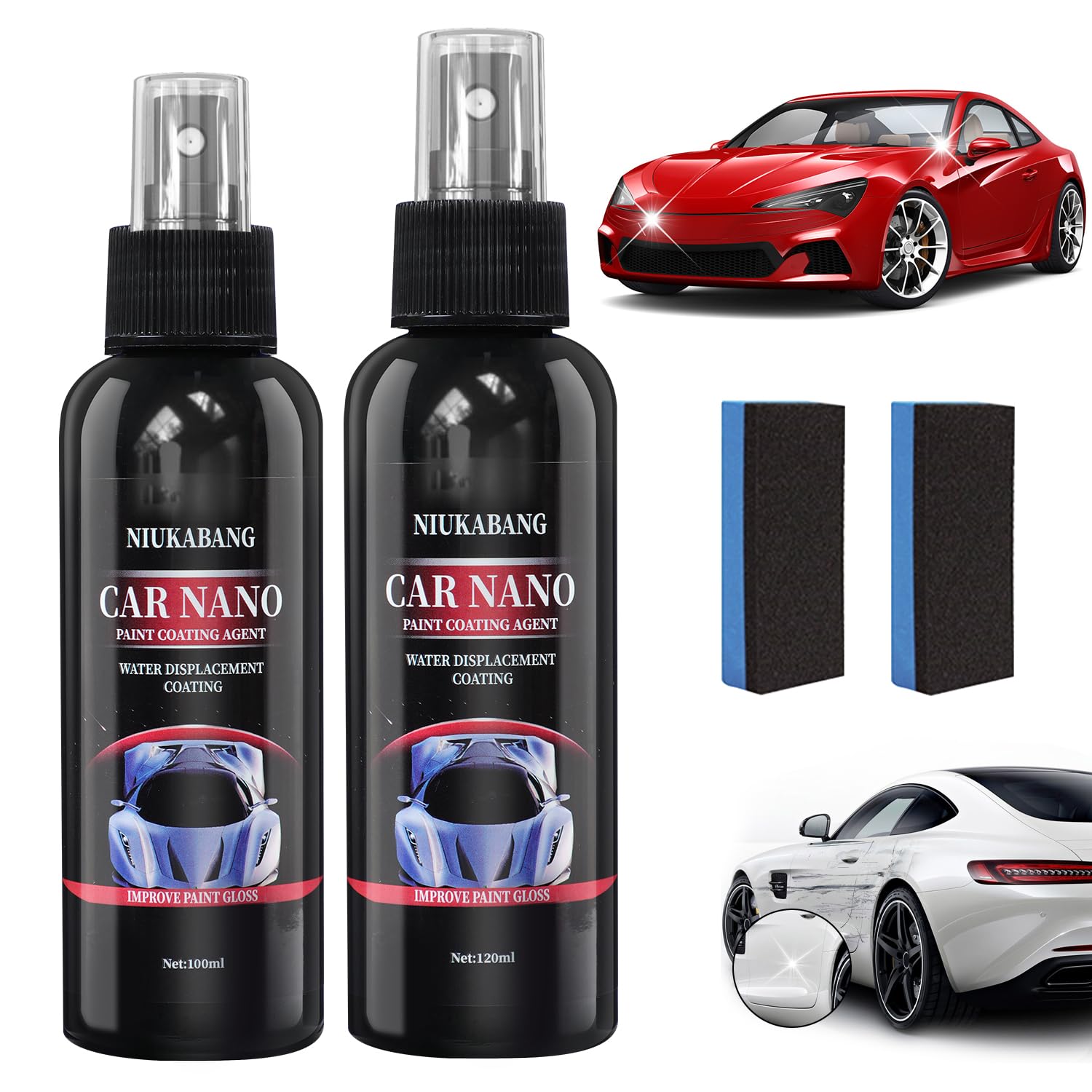 Highly Disappointed in this ad it doesn’t do anything except maybe add a little shine.. That’s what wax is for.. Also didn’t explain why it sent little black pads with blue backs when Directions stated spray on and wipe with soft cloth..? So the Nano expectation of doing magic is Not in this product and promises..