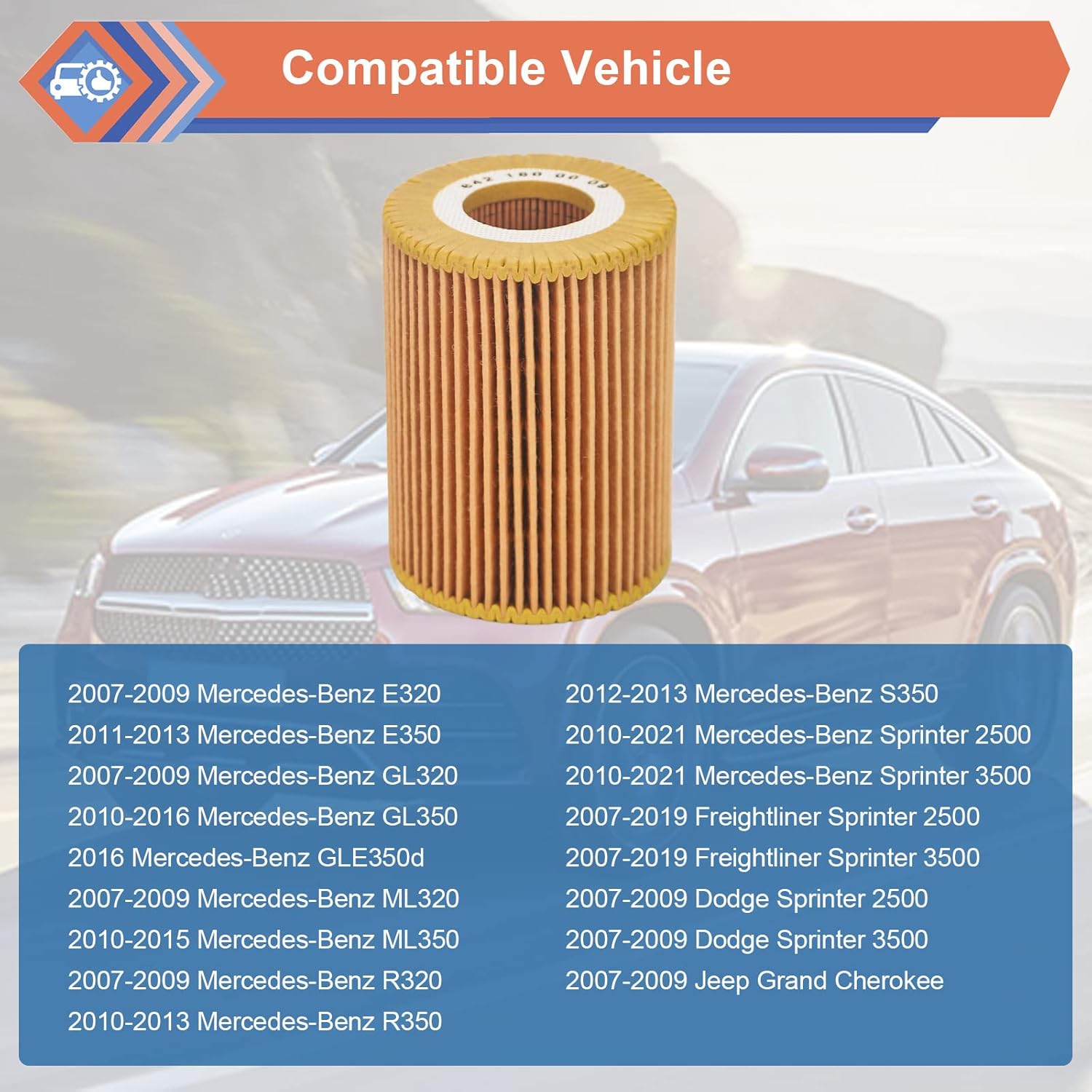 - Compatible Vehicle – Este filtro de óleo é compatível com veículos Mercedes-Benz de 2007 a 2021, incluindo E320 (2007-2009), E350 (2011-2013), GL320 (2007-2009), GL350 (2010-2016), ML320 (2007-2009), ML350 (2010-2015), R320 (2007-2009), R350 (2010-2013), S350 (2012-2013), e Sprinter 2500 e 3500 (2010-2021). Também é compatível com veículos Freightliner (2007-2019) e Dodge (2007-2009), além do Jeep Grand Cherokee (2007-2009).