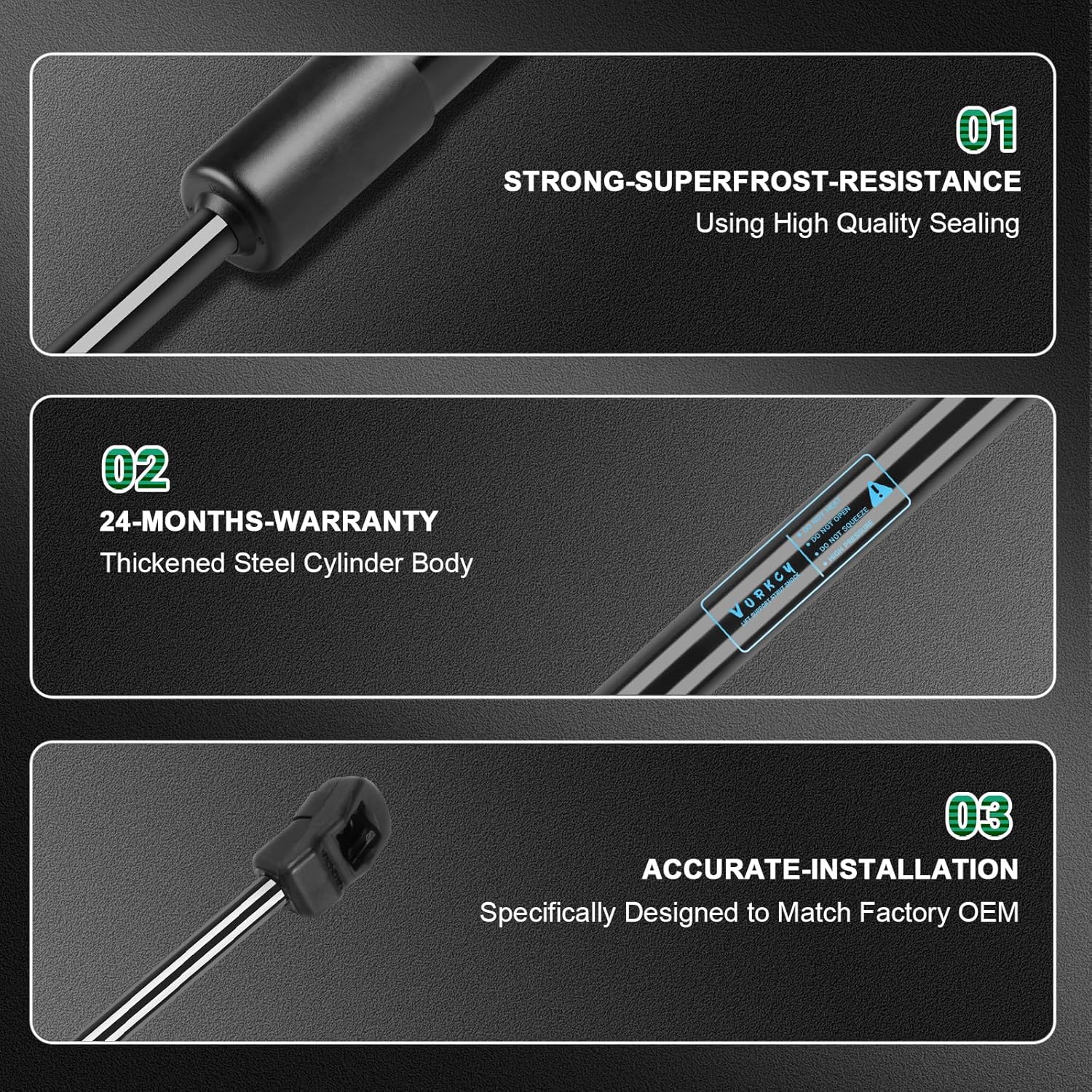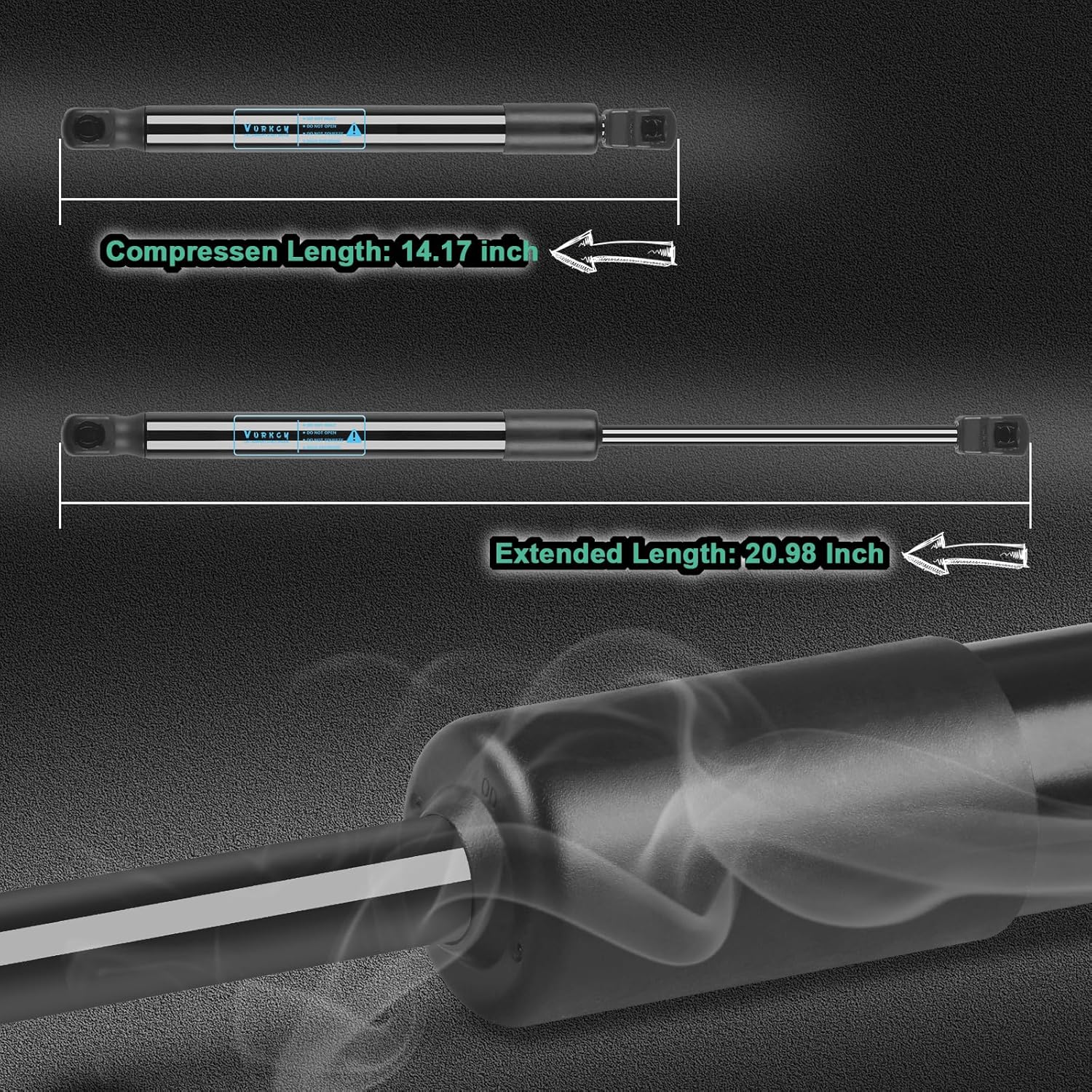 Com um comprimento comprimido de 14,17 polegadas e um comprimento estendido de 20,98 polegadas, esses amortecedores são perfeitamente dimensionados para se encaixar na sua SUV, proporcionando um suporte confiável e seguro. A instalação é simples e não requer ferramentas especiais, permitindo que você substitua os suportes antigos rapidamente e sem complicações.
