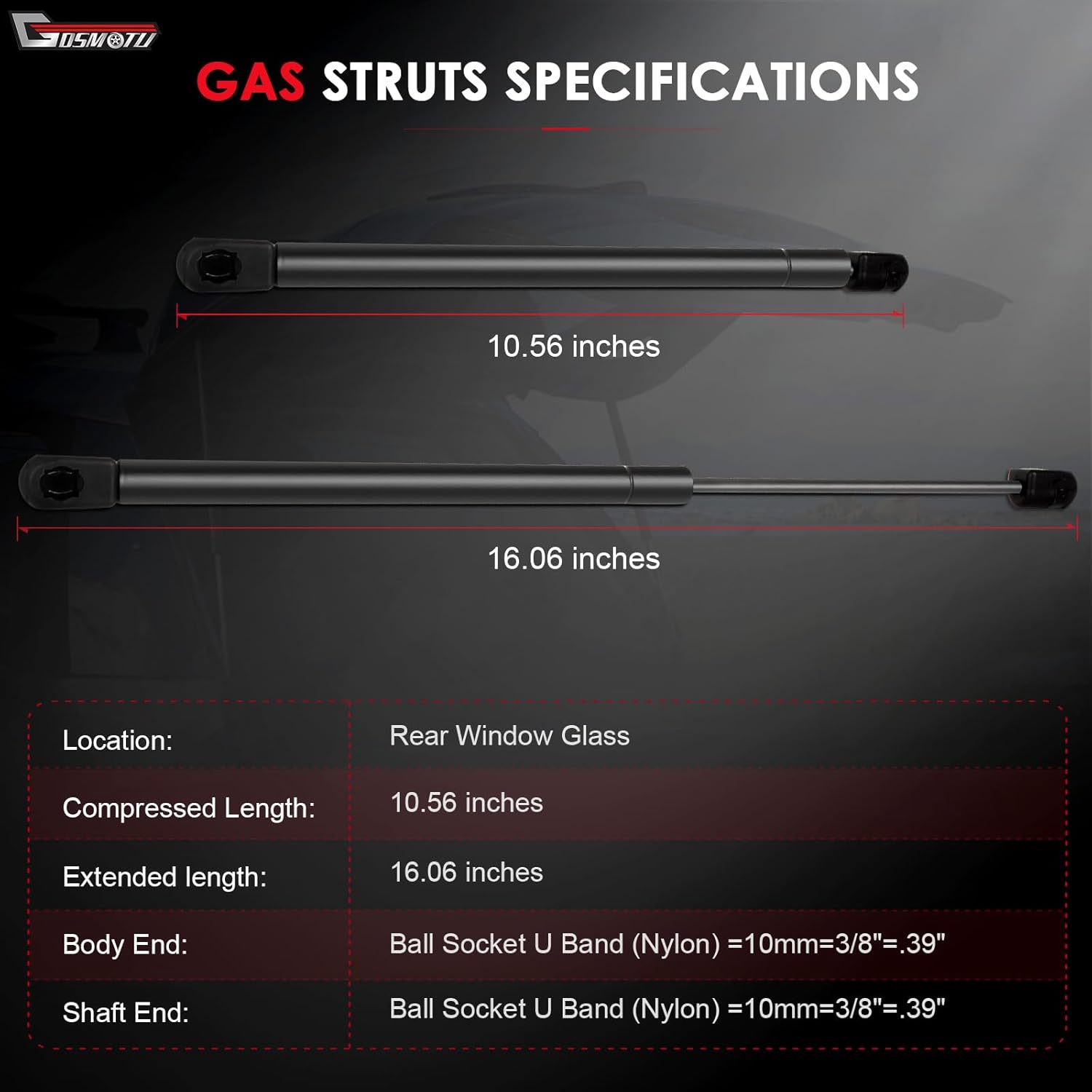 - Dimensões: Os choques de vidro traseiro possuem um comprimento estendido de 16.06 polegadas e um comprimento comprimido de 10.56 polegadas, proporcionando a altura ideal para a operação do vidro traseiro.