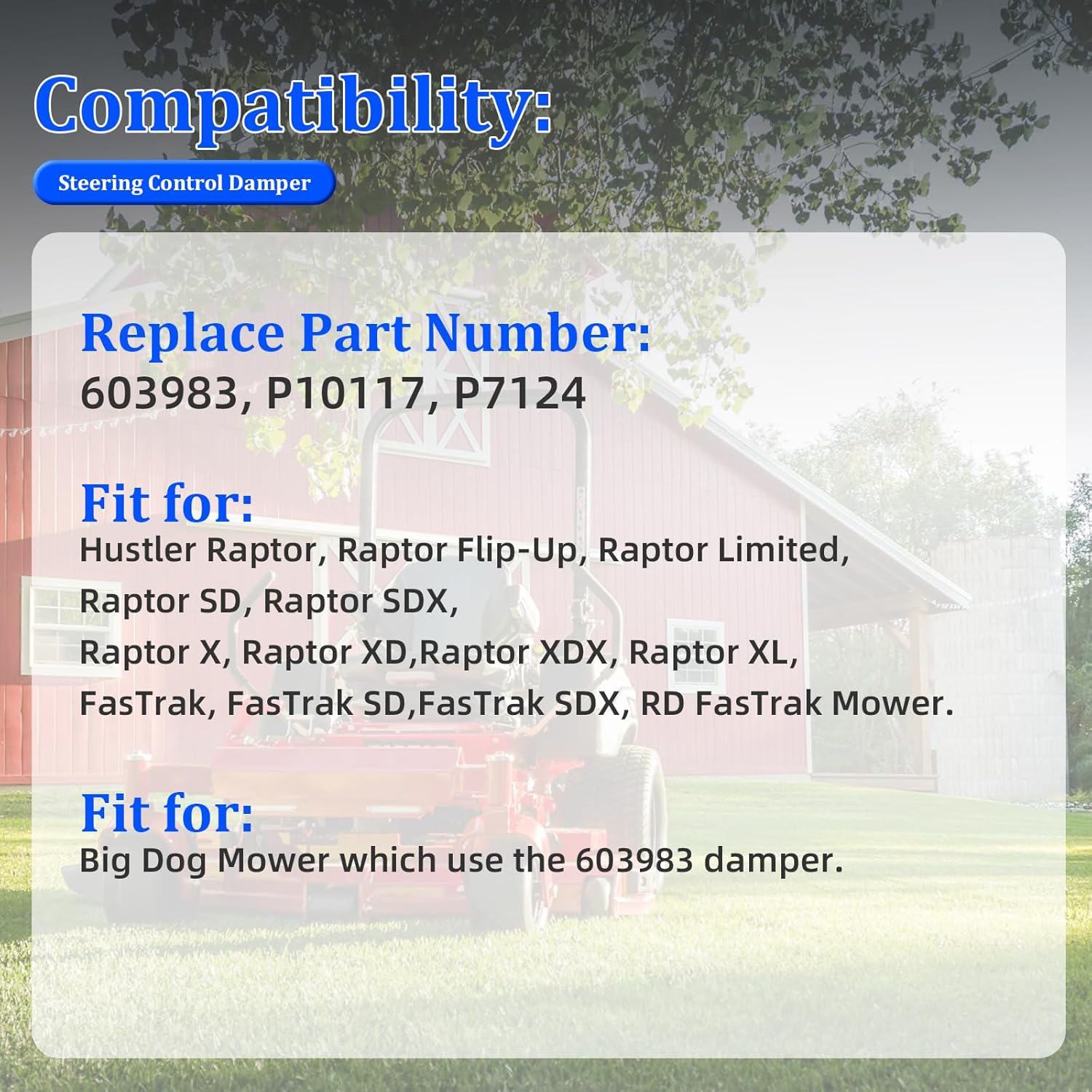 – Compatibilidade: Projetado para modelos Hustler Raptor, Raptor Flip-Up, Raptor Limited, Raptor SD, Raptor SDX, Raptor X, Raptor XD, Raptor XDX, Raptor XL, FasTrak, FasTrak SD e FasTrak SDX, além de cortadores BigDog que utilizam o amortecedor 603983.