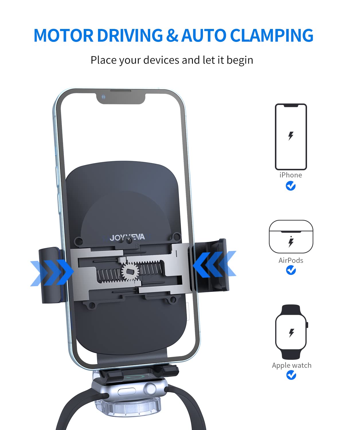 – Auto-Clamping: Garras que se fecham automaticamente ao detectar o dispositivo.