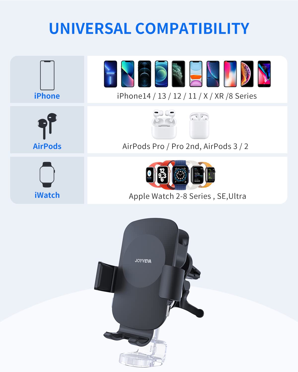 O Carregador Veicular Sem Fio 3 em 1 da JOYVEVA é a solução definitiva para os fãs da Apple que buscam praticidade e eficiência durante suas viagens. Com um design inovador, este carregador é o primeiro a integrar a funcionalidade de carregar simultaneamente um iPhone, um Apple Watch e AirPods, tudo em um único dispositivo. Ao eliminar a desordem de cabos e maximizar o uso do espaço no carro, você pode simplesmente colocar seus dispositivos no suporte e desfrutar de um carregamento rápido e sem complicações, ideal para longas distâncias.
