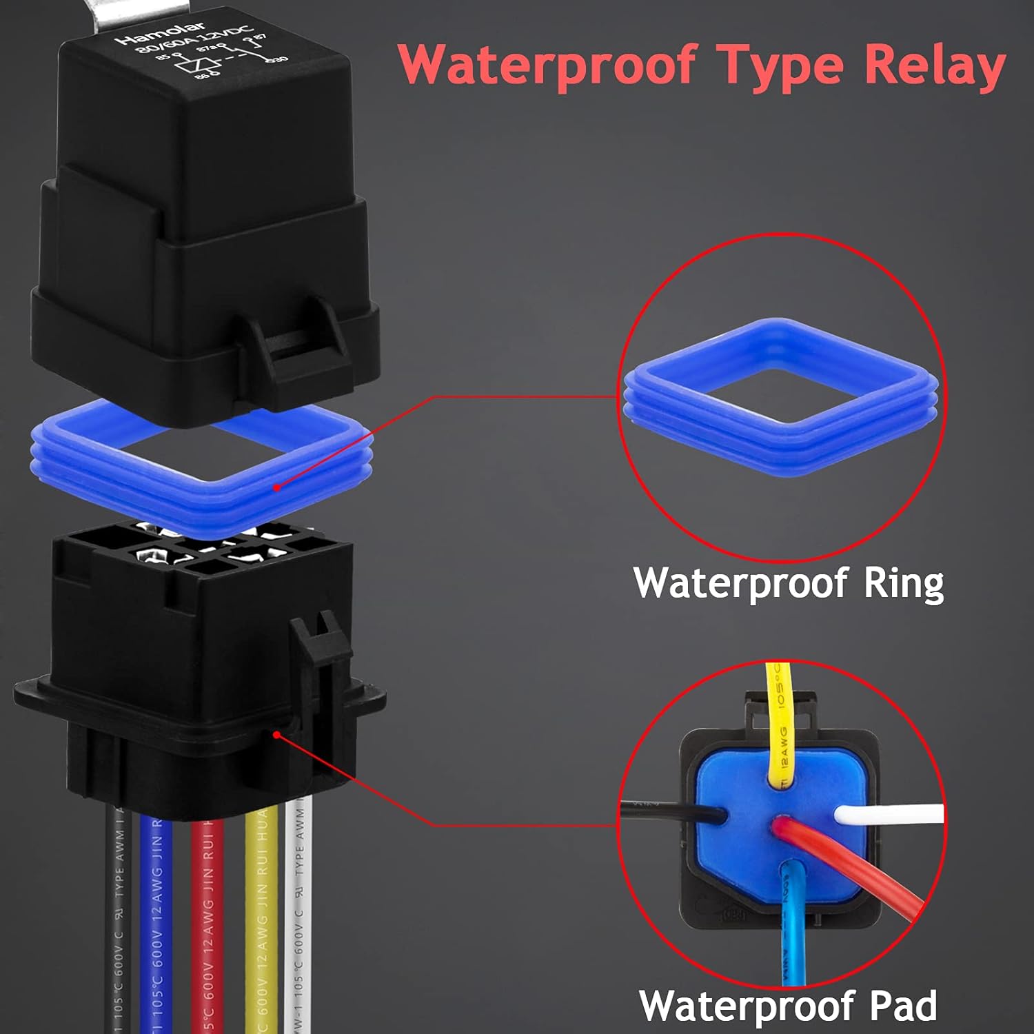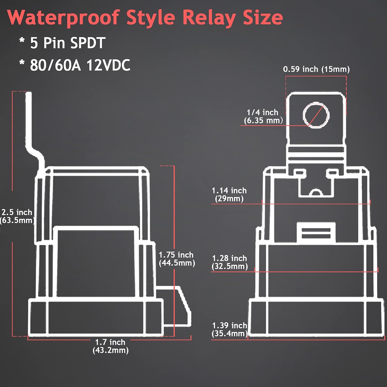 I used this to control power to spotlights on my motorcycle light bar so the water tightness was an important consideration. However, the relay is larger than typical 4 or 5 pin automotive relays making it difficult for me to find a location to place it unseen on the motorcycle. I did manage a spot under the seat but others may have to consider the size prior to ordering if you have similar issues.