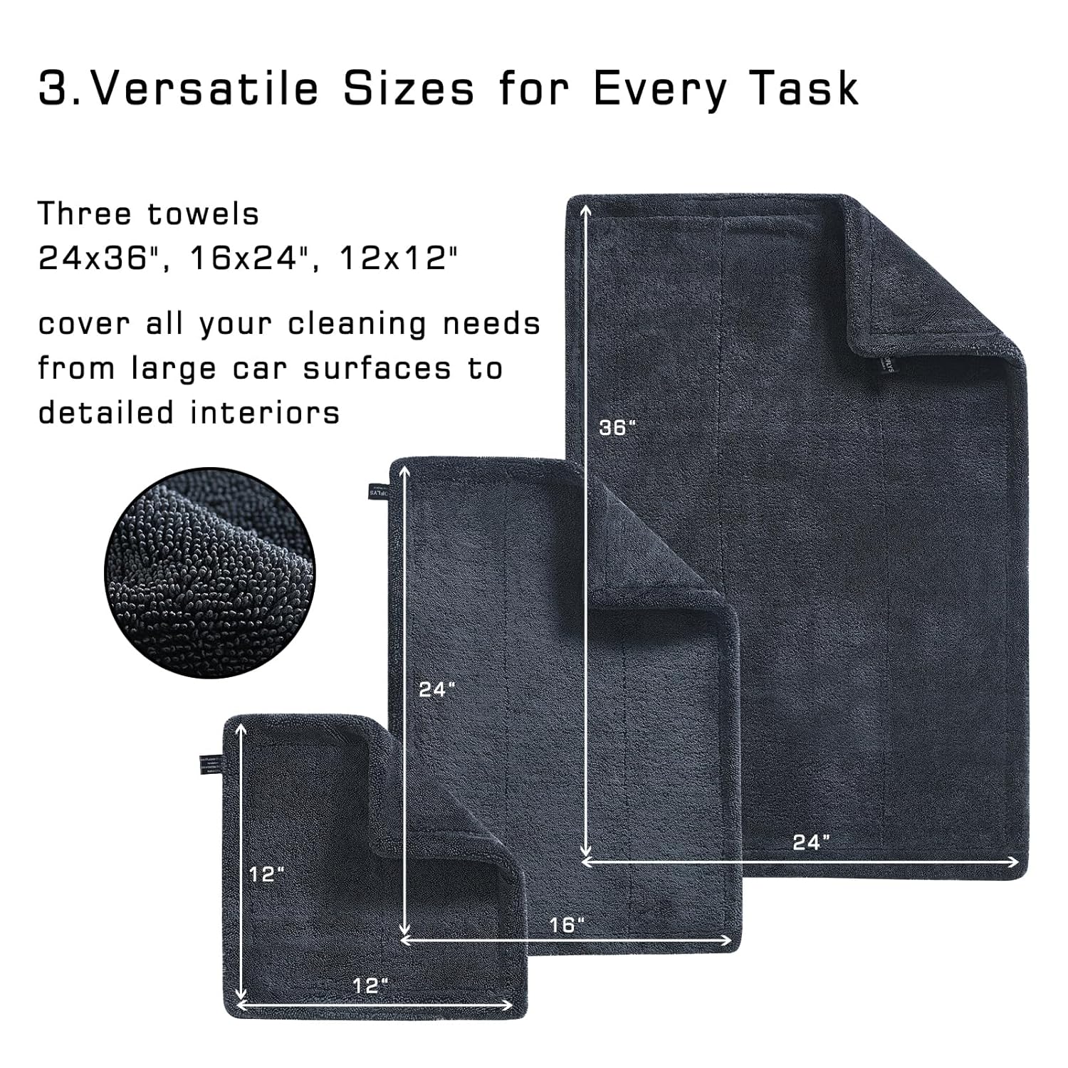 You can actually dry your entire vehicle with the large towel in this set. And you will no doubt find uses for the other 2 towels in the set. I drive a Tacoma pickup and am glad to break free from using a chamois and having to stop and wring it out more than 10 times during the drying process. Using this towel shaved at least 15 minutes off the car wash routine. The only down side is that there is no way to wring out the water by hand and it needs to hang somewhere for a few days to release all the water it had absorbed.