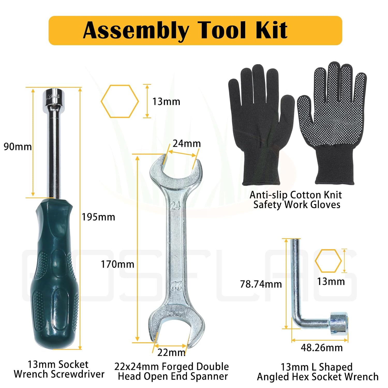 Para facilitar a instalação, o Conjunto de Montagem de Eixo 461663 vem acompanhado de um Kit de Ferramentas de Montagem, que inclui: 1 chave de boca forjada dupla de 22x24mm, 1 chave soquete de 13mm, 1 chave hexagonal em L de 13mm e 1 par de luvas de segurança de algodão anti-derrapante. Com essas ferramentas, a substituição do eixo torna-se um processo simples e conveniente.