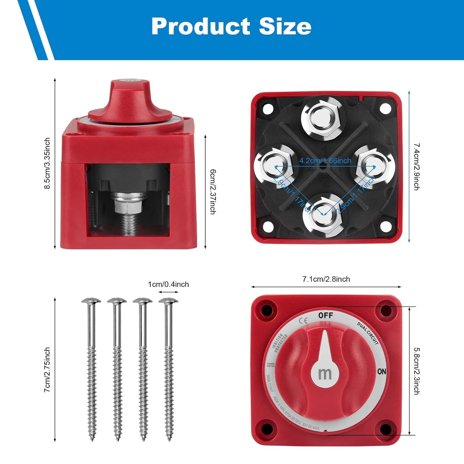 The AOWEITOUR 300A Boat Battery Disconnect Switch is a high-quality, durable, and versatile solution for managing the electrical power in boats, RVs, trucks, cars, and other vehicles. With its 300A capacity, 1-Both-2-Off design, ignition protection, and weatherproof construction, it offers excellent reliability and safety for both professional and DIY users.