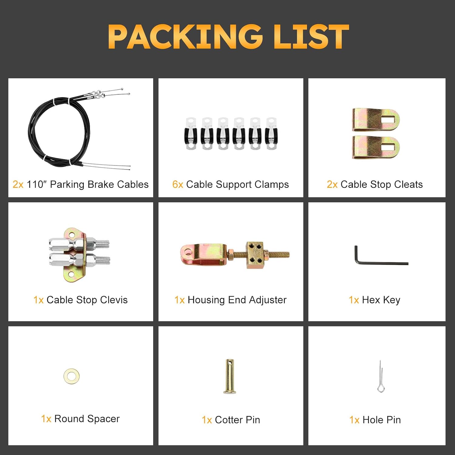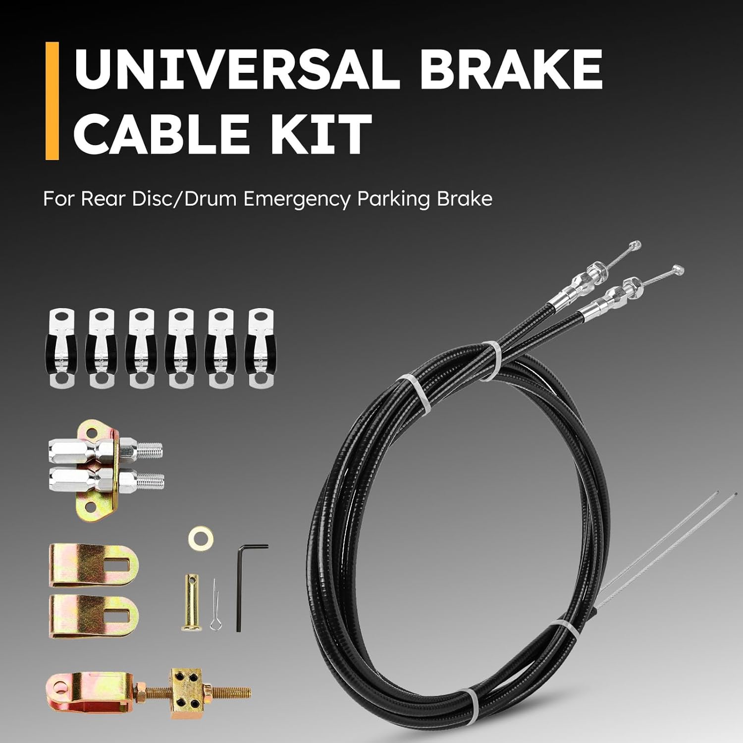 Resposta: O kit inclui 2 cabos de freio de estacionamento de 110″, 6 suportes de cabo, 2 grampos de parada de cabo, 1 clevis de parada de cabo, 1 ajustador de extremidade de habitação, 1 chave hexagonal, 1 espaçador redondo, 1 pino de segurança e 1 pino de furo.
