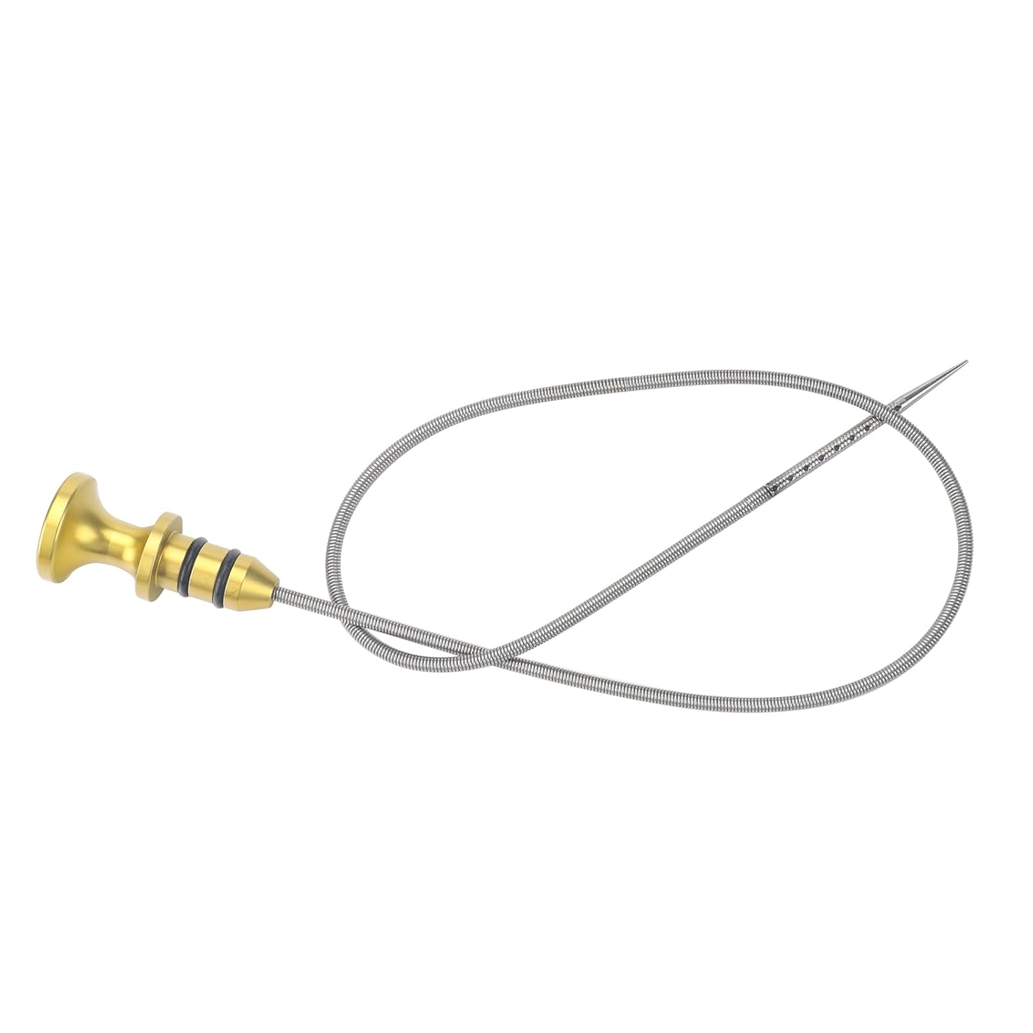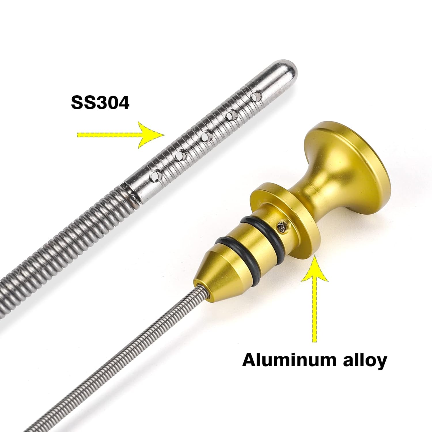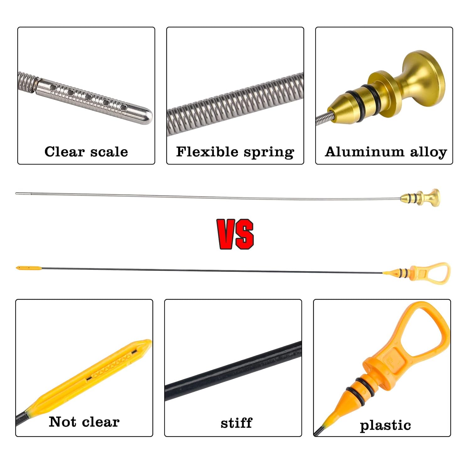 O dipstick é fabricado em material de alumínio billet de alta qualidade, garantindo que não quebre ou grude, proporcionando um funcionamento mais flexível. A parte da mola foi projetada para não ser excessivamente macia, permitindo que o medidor passe por designs complexos do motor sem se quebrar. Um cliente comentou sobre a flexibilidade do produto, mas essa característica é intencional, pois apenas a flexibilidade moderada é necessária para garantir durabilidade e resistência.